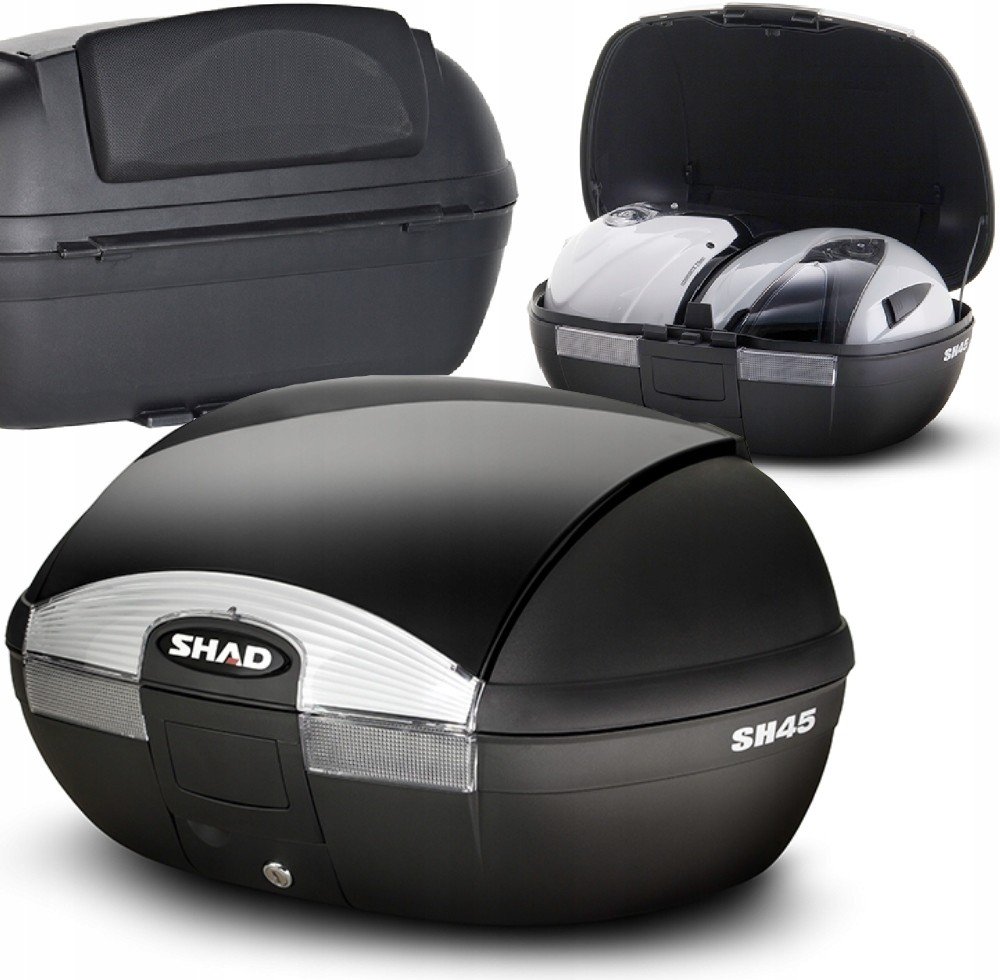 SH45 kufr s velkou kapacitou pro 2 helmy. Opěrka, brzdové světlo, vnitřní taška a barevné kryty dostupné. Včetně plotny.