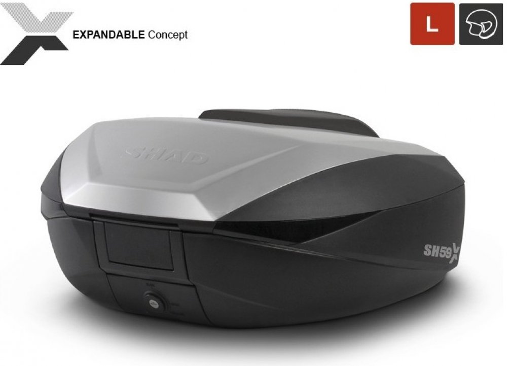 SH59X je jedinečný vrchní kufr na motorku na trhu. Jeho inovativní design umožňuje regulovat objem ve 3 různých polohách během několika vteřin (46, 52 a 59 litrů), a je tak možné do něj uložit až 2 XXL helmy, aniž byste je museli pokládat na bok, plus cestovní doplňky. Uvnitř má tento kufr přidržovací popruhy, které zajišťují, že se náklad během jízdy nepohybuje.Horní víko kufru je vyrobeno z hliníku o tloušťce 0,8 mm a zbytek je vyroben ze zesíleného polypropylenu. Jeho konstrukce zaručuje vysokou tuhost a odolnost při zachování minimální hmotnosti. Jako příslušenství lze do tohoto kufru dokoupit vnitřní rozšiřitelnou tašku (X0IB10). Tato taška s vrchním otevíráním a vnější kapsou je perfektní doplněk, kdy je třeba převézt náklad bezpečně a pohodlně. Je vyrobena z vysoce kvalitních materiálů.Kufr SH59X nabízí maximální zabezpečení díky inovativnímu hermetickému zámku „Smart Lock System“, s automatickou sklopnou rukojetí a hermetickým zámkem se třemi polohami. Tento systém umožňuje otevřít a zavřít kufr pouze jednou rukou bez klíče. Klíč použijeme pouze pokud chceme kufr zamknout nebo odemknout nebo sejmout či připevnit k motorce.Díky špičkové technologii a inovativnímu designu získal vrchní kufr SH59X prestižní cenu Reddot Design Award 2017, což je pojem mezi designéry a výrobci. Patentovaný systém, který reguluje objem SH59X a umožňuje zvětšení nebo zmenšení jeho velikosti, jej přeměňuje na vysoce funkční a praktický vrchní kufr, který se za všech okolností přizpůsobí potřebám motorkářů:- velikost L: nabízí objem 46l, vhodný pro každodenní přepravu všeho potřebného- velikost XL: druhá poloha, která nabízí objem až 52l, vhodná pro kratší víkendové výlety s kapacitou pojmout až 2 XL přilby- velikost XXL: třetí poloha, která nabízí objem až 59l, dost velký na to, abyste uvezli vše, co potřebujete pro úžasné dobrodružství, o kterém jste tak dlouho snili. S kapacitou pro uložení 2 XXL přileb