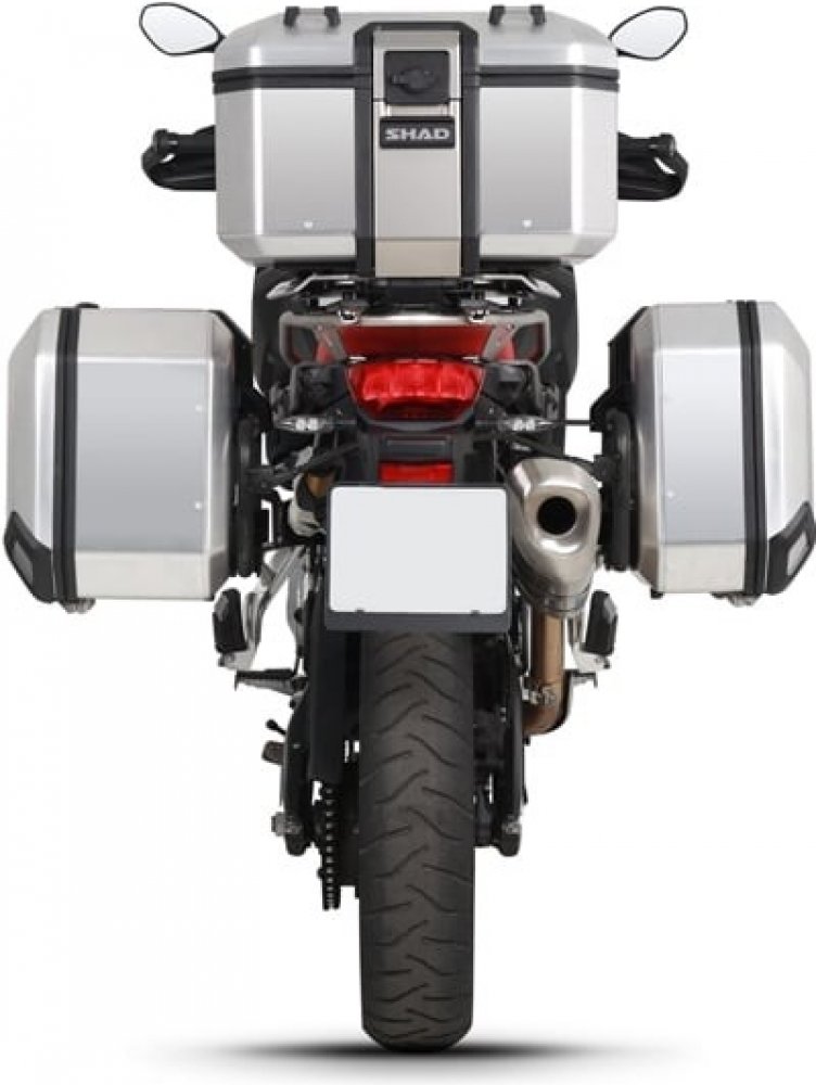 Kompletní sada bočních hliníkových kufrů SHAD TERRA obsahuje levý kufr TR47 o kapacitě 47L a menší pravý kufr TR36 o kapacitě 36L kvůli umístění výfuku. Pravý kufr tak nebude vyčnívat. Sada obsahuje vše, co potřebujete k montáži obou kufrů.