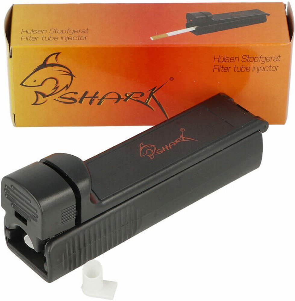 Ruční plnička cigaretových dutinek Shark. Plastová plnička cigaret umožňuje plnit cigaretové dutinky jednotlivě a je určená pro plnění dutinek klasické velikosti King Size o průměru 8 mm. Plastový povrch plničky je v černém polomatném provedení. Vyrobení vlastní cigarety je jednoduché. Otevřete plničku, prostor pro tabák naplníte Vaší oblíbenou směsí, cigaretovou dutinku nasadíte na plastový hrot ...