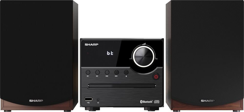 mikro Sharp s externími reproduktory 2.0 stereo pro prostorový stereo zážitek 45 W pro malou místnost (do 15 m²) 1 CD-DA, MP3 40 AUX, Bluetooth, USB 17 cm 15 cm 14.5 cm 22.3 cm 17.7 cm 4 kg