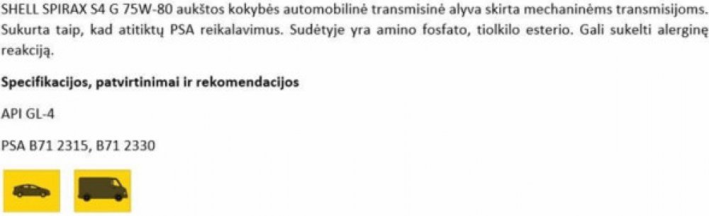 Spirax S4 G 75W-80 je speciální převodový olej, zvláště vyvinutý pro manuální převodové skříně s hypoidními soukolími, ve vozech Peugeot a Citroën. Je určený pro použití v nejnáročnějších podmínkách rázového zatížení, přetížení atd. Díky své formulaci umožňuje snadné řazení za všech teplot, minimalizuje ztráty třením a poskytuje převodům maximální ochranu.
