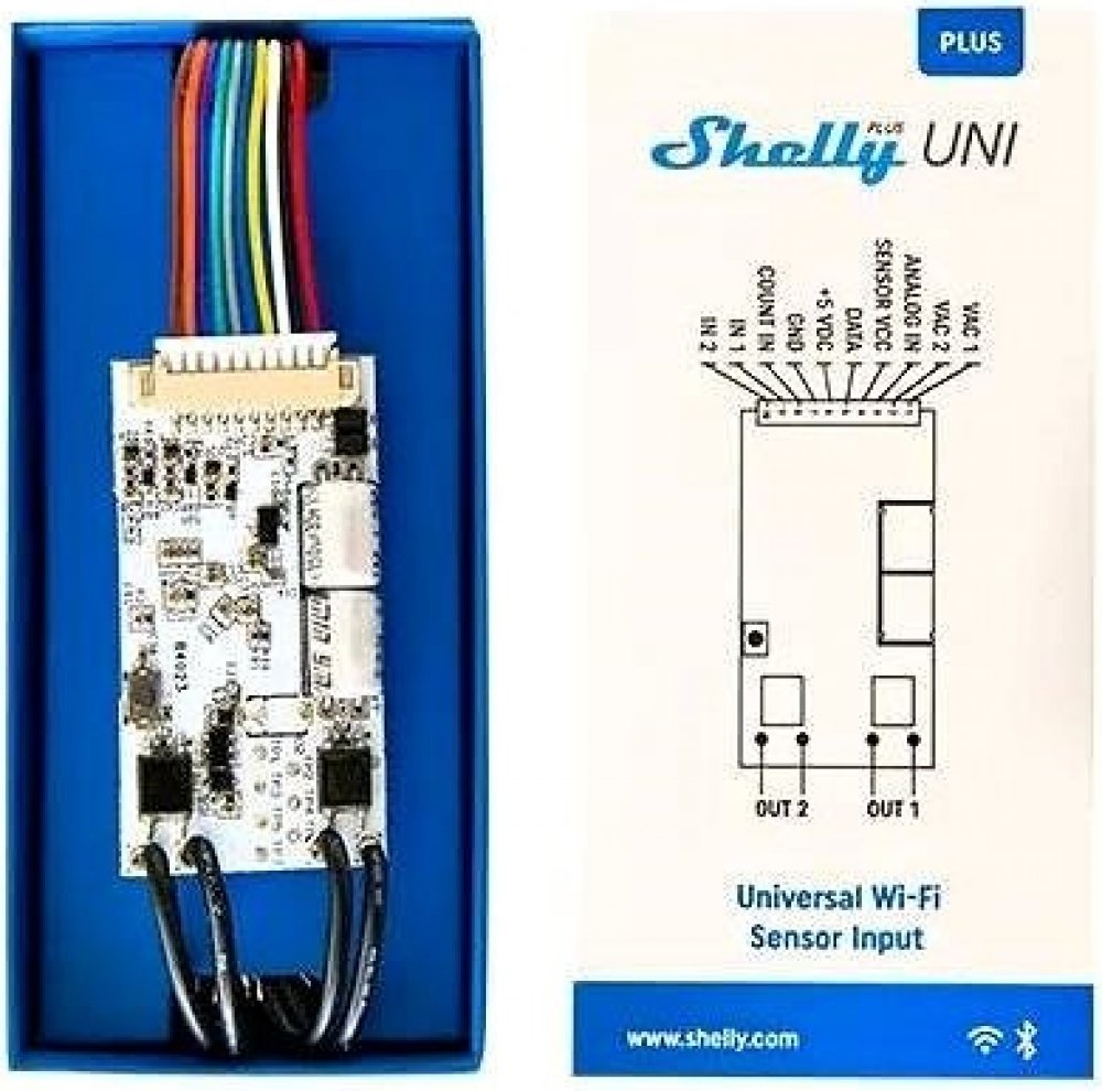 Shelly Plus UNI je univerzální WiFi řídicí jednotka, která vám umožní plnou kontrolu nad vašimi elektrickými zařízeními odkudkoli. Pomocí této jednotky můžete snadno řídit osvětlení, vytápění či větrání přes chytrý telefon nebo jiná zařízení.Užijte si pohodlí a flexibilitu s Shelly Plus UNI, která umožňuje dálkové ovládání vašich zařízení, i když nejste doma. Tento modul je plně kompatibilní s oblíbenými platformami, jako jsou Google, Samsung SmartThings a Alexa. Snadno jej integrujete do svého stávajícího systému.Shelly Plus UNI je vybaven dvěma polovodičovými relé, čítačem impulsů a dalšími vstupy, které zaručují široké možnosti využití. Můžete jej ovládat jak přes místní síť WiFi, tak přes cloudové služby.SpecifikaceVýrobce:ShellyModel:Plus UNINapájení:8-24 VAC; 9-28 VDC; 5 VDC (stabilizované, přes +5 VDC a GND)Spotřeba energie:< 1 WOdpor digitálních vstupů:50 kΩSpouštěcí napětí digitálních vstupů:1,5 V (aktivní nízká úroveň)Maximální spínací napětí:30 VMaximální spínací proud:300 mAVoltmetr:0-15 VDC / 0-30 VDC (dvoupásmový)Spouštěcí vstup pulzního čítače napětí:1,5 V (aktivní nízká úroveň)Maximální frekvence pulzů čítače:1 kHzPodporované externí snímače:Jeden snímač DHT22 nebo až pět snímačů DS18B20.Protokol Wi-Fi:802.11 b/g/nDosah Wi-Fi:Až 30 m uvnitř a až 50 m venkuProtokol Bluetooth:4.2Dosah Bluetooth:Až 10 m uvnitř a až 30 m venkuCPU:ESP32Paměť Flash:4 MBPlány:20Webhooks (sdílené URL):20 s 5 adresami URL na jeden webhookSkripty:AnoMQTT:AnoCoAP:NeRozměry:40 x 21 x 7 mmHmotnost:8,5 gOkolní teplota:-20 °C až 40 °CVlhkost:30 % až 70 % relativní vlhkosti