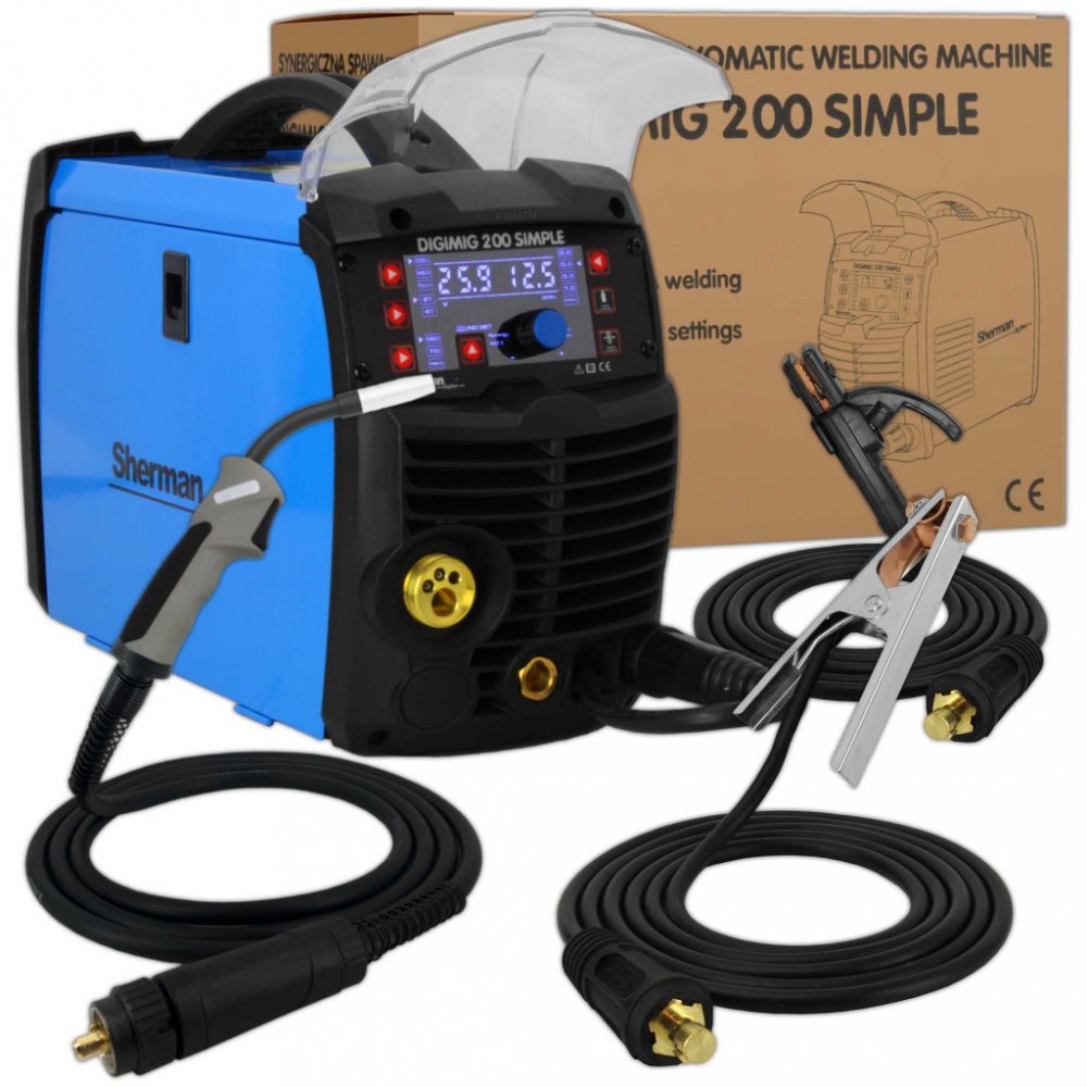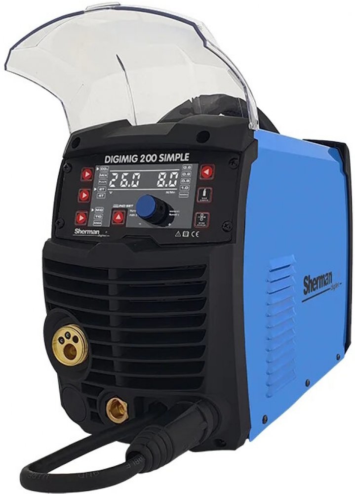 Svařovací stroj DIGIMIG 200 SIMPLE synergy je snadno použitelné zařízení pro svařování oceli a neželezných kovů metodami MMA (svařování kovů magnetickým obloukem), TIG Lift a MIG. Lze jej použít také k pájení tenkých pozinkovaných plechů.Metodu MIG lze používat v ručním i synergickém režimu, což zjednodušuje její obsluhu. Díky změně polarity umožňuje stroj svařování metodou MIG jak standardními ochrannými dráty, tak práškovými dráty bez nutnosti použítí ochranného plynu.Digitální řízení umožňuje plné nastavení parametrů, dynamiky a charakteristiky oblouku. Použití synergického nastavení svářečky pro uhlíkovou ocel výrazně zjednodušuje obsluhu a umožňuje použití i osobám s menšími zkušenostmi a hobby uživatelům.Během svařování metodou MMA lze nastavit hodnoty HOT START, ARC FORCE a VRD. Přístroj má paměť posledního nastavení, což znamená, že po vypnutí a opětovném zapnutí se obnoví naposledy nastavené parametry.Součástí dodávky je hořák MIG 15/ 3m, zemnicí kabel a elektrodový kabel.