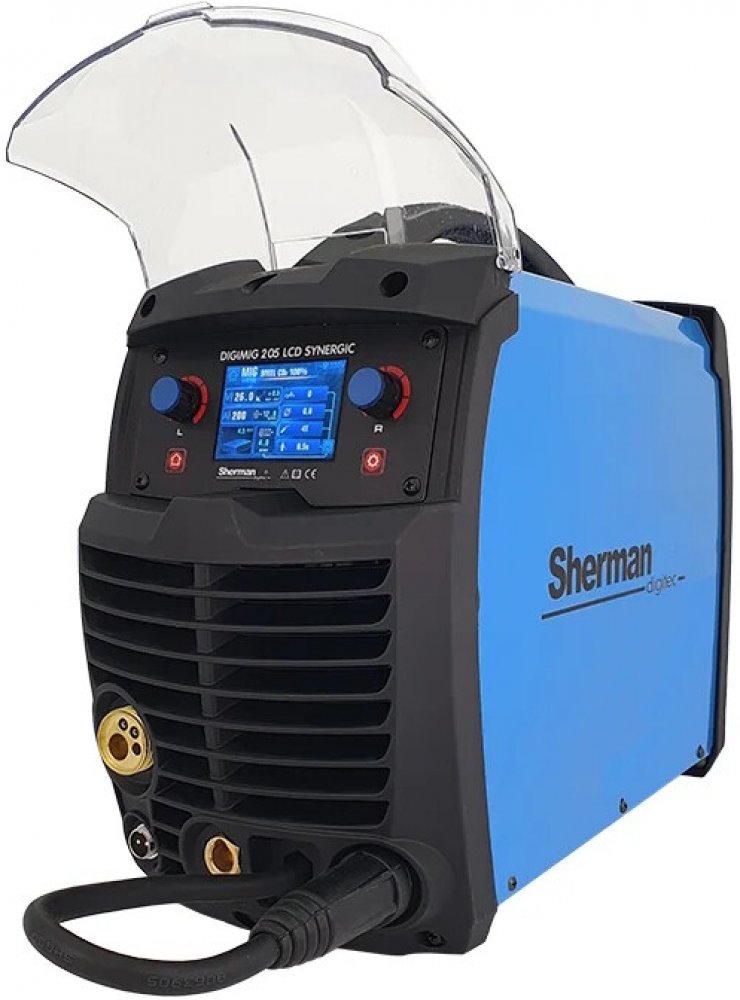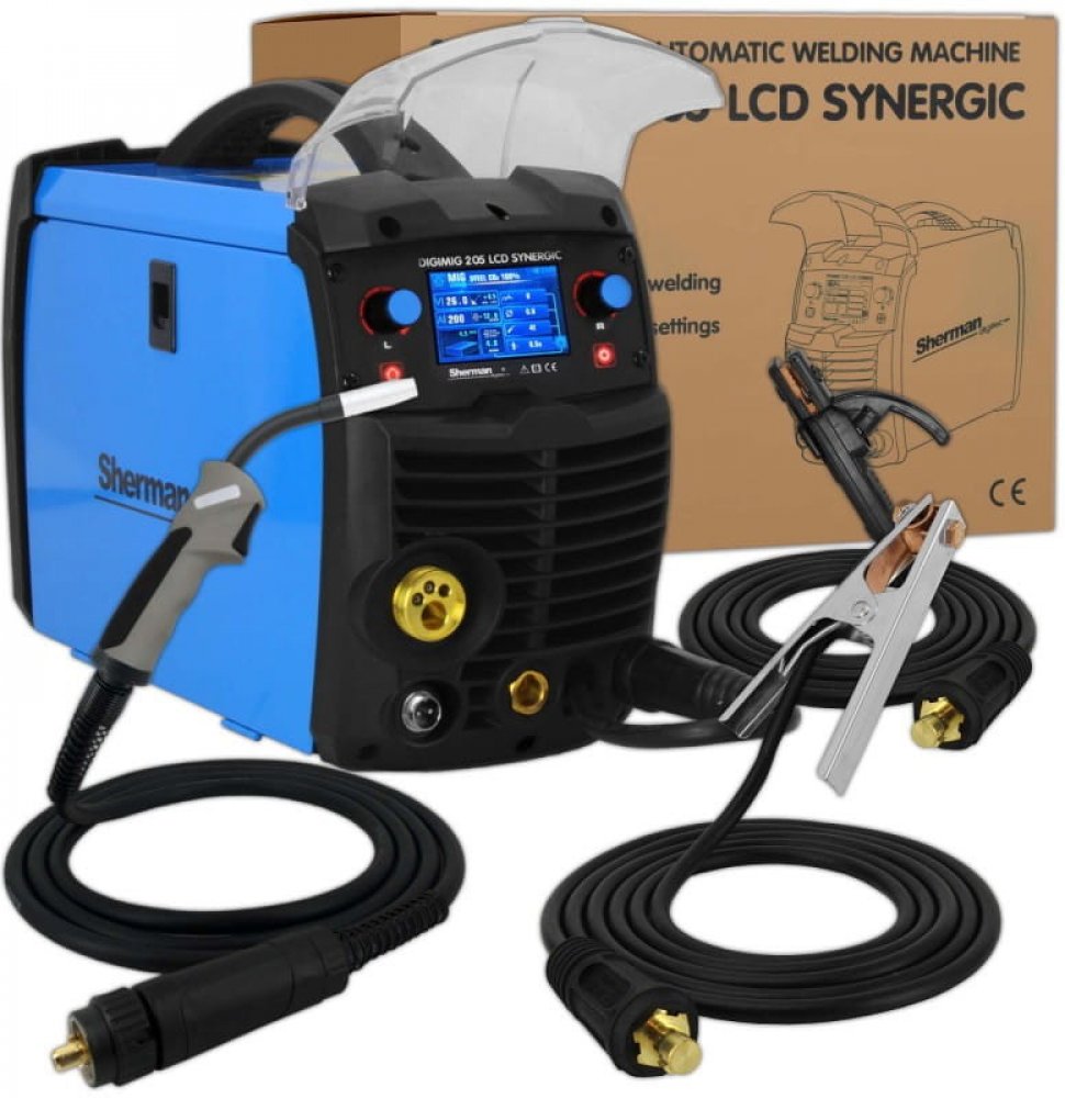 Invertor DIGIMIG 205 LCD SYNERGIC se používá k ručnímu svařování oceli a neželezných kovů. Lze jej použít také k pájení tenkých (do 3 mm) pozinkovaných plechů.Lze jej použít pro svařování metodou MMA (svařování elektrodou), TIG Lift a MIG. Metodu MIG lze používat v ručním i synergickém režimu, což značně zjednodušuje obsluhu.Díky změně polarity umožňuje svařování metodou MIG jak standardními ochrannými dráty, tak i práškovými dráty bez nutnosti použití stínícího plynu.Digitální řízení umožňuje plné nastavení parametrů, dynamiky a charakteristiky oblouku. Použití synergického nastavení svářečky pro uhlíkovou ocel i hliník výrazně zjednodušuje její obsluhu a umožňuje ji používat i osobám s menšími zkušenostmi a hobby uživatelům.Během svařování metodou MMA lze nastavit hodnoty HOT START, ARC FORCE a VRD.Stroj má paměť posledního nastavení, tzn. že po vypnutí a opětovném zapnutí se obnoví naposledy nastavené parametry. Díky funkci Fan Stop, která vypíná ventilátor, když je svářečka málo zatížená, se výrazně snižuje hlučnost.Součástí dodávky je hořák MIG 15 /3m, zemnicí kabel a kabel s elektrodovými kleštěmi.