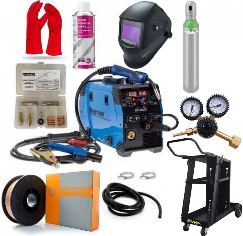 Giga set svářečka MIG 200HD Sherman + příslušenství určený pro svařování oceli a neželezných kovů. Možnost zvaření drátem (MIG/MAG), elektrodou (MMA) a netavící se elektrodou (TIG škrtem). Při změně polarizace lze svařovat i trubičkovým (trubkovým) drátem bez použití plynu.