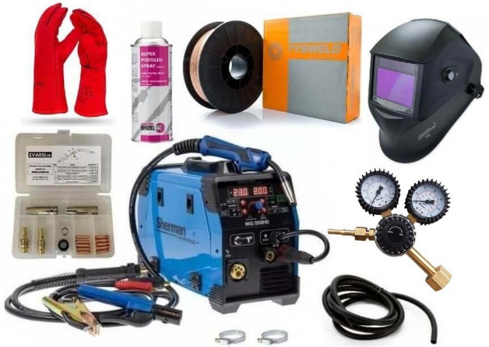 Mega set svářečka MIG 200HD Sherman + příslušenství určený pro svařování oceli a neželezných kovů. Možnost zvaření drátem (MIG/MAG), elektrodou (MMA) a netavící se elektrodou (TIG škrtem). Při změně polarizace lze svařovat i trubičkovým (trubkovým) drátem bez použití plynu.