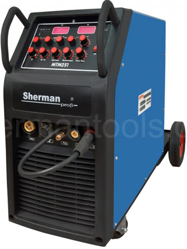 Svařovací stroj Sherman MTM 251 používá se pro ruční svařování oceli a neželezných kovů v ochranném plynovém štítu (metoda MIG/MAG), metoda TIG, a obalenou elektrodou (metoda MMA).