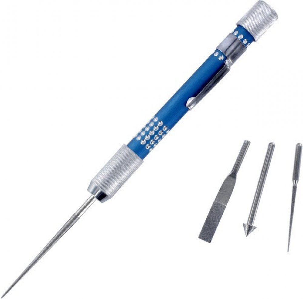 Čtyřdílná sada diamantových jehlových pilníků Modelcraft a rukojeť jsou výborným nástrojem na obrábění velmi tvrdých kovových součástí. Do rukojeti lze uložit výměnné nástroje, mají délku 45 až 65 mm a tvary kuželové špičaté dlouhý a krátký, plochý a kuželovitý odjehlovač. Délka rukojeti je 117 mm.