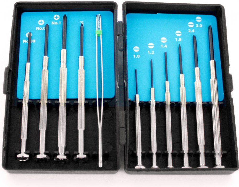 Modelcraft hodinářské šroubováky (sada 10ks) využijete pro drobný spojovací materiál. Ploché šroubováky 1.0, 1.2, 1.4, 1.8, 2.4, 3.0mm, křížové Phillips 00,0,1, hrot a pinzeta, vše v plastové kazetě. Délka rukojeti 50 - 70 mm, průměr 3 - 4 mm, délka dříku 20 - 26 mm.