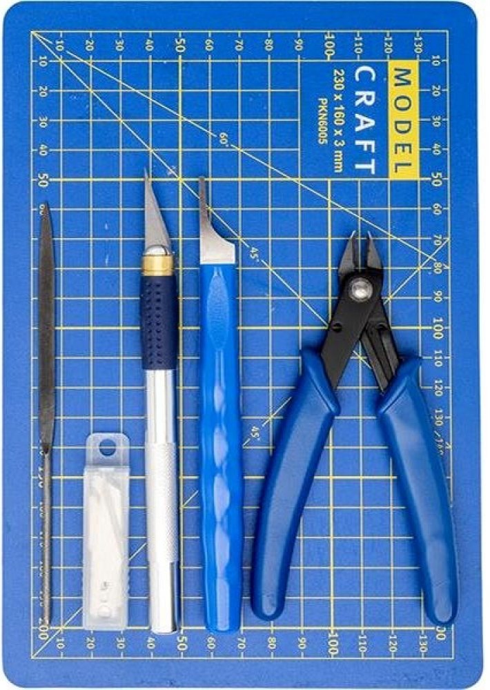 Modelcraft nářadí pro plastikové modely (sada 10ks) lze využít nejen při stavbě plastikových modelů. Obsahuje řezací podložku o rozměrech 230x160x3mm, modelářský nůž s hliníkovou rukojetí a náhradními čepelemi, plochý pilník, nástrojem na odjehlení hran a štípací kleště.