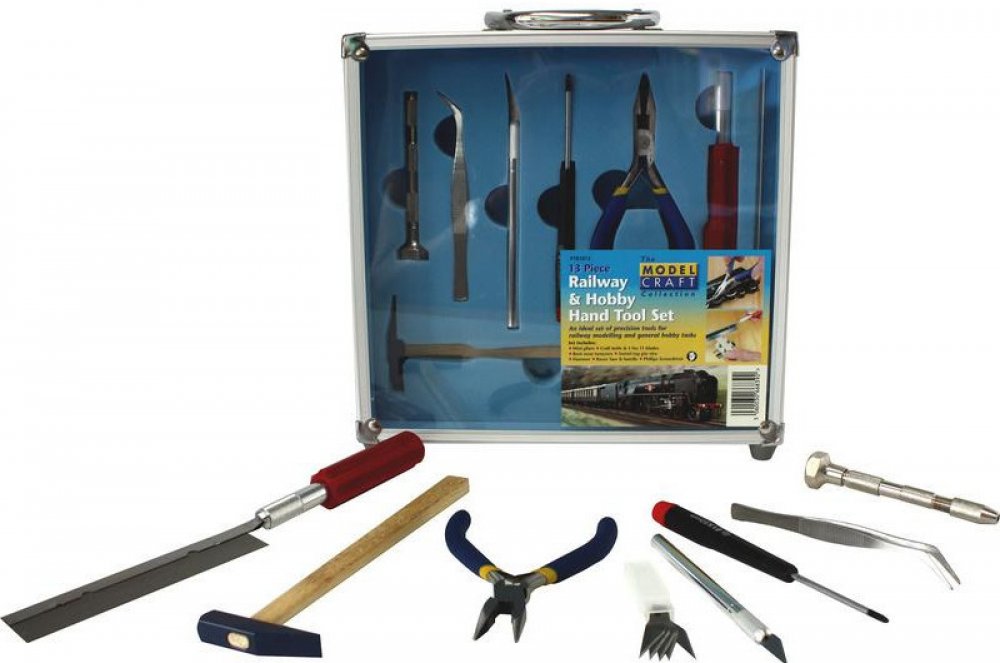 Modelcraft nářadí pro železniční modeláře (sada 13ks) je určena nejen pro stavbu modelů lodí ale i pro běžné řemeslníky a modeláře. Dodává se v atraktivním hliníkovém kufru 240mm x 235mm x 60mm. Hmotnost 697g. Obsahuje mini kleště, řezací nůž a 5 čepelí č.11, pilka s rukojetí, křížový šroubovák, kladívko, zahnutou pinzetu a Modelcraft mini ruční vrtačku.
