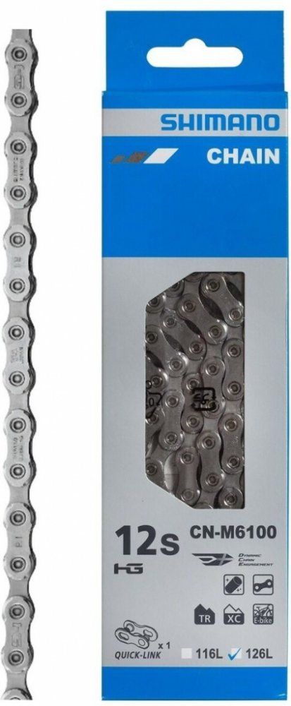 12 rychlostní řetěz DEORE M6100. Speciální konstrukce řetězu zaručuje hladké a plynulé řazení a vysokou pevnost. Vylepšené vedení řetězu. Rozšířená vnitřní část článku řetězu zlepšuje záběr a jeho držení na pastorkách. Jednoduchá instalace s rychlospojkou SMCN910-12. Použité technologie: HG, Sil-Tec, HYPERGLIDE+. Typ: UNI, Celková hmotnost balení: 346g, 12 rychlostní, 138 článků, Typ řetězu: HG 12...
