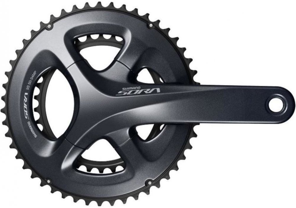 Střed SORA R3000 s integrovanou osou ( dvoudílný ), pro 9 rychlostí, kliky z hliníkové slitiny s hliníkovými převodníky. Integrovaná osa zaručuje maximální přenos výkonu z jezdce na kolo.
