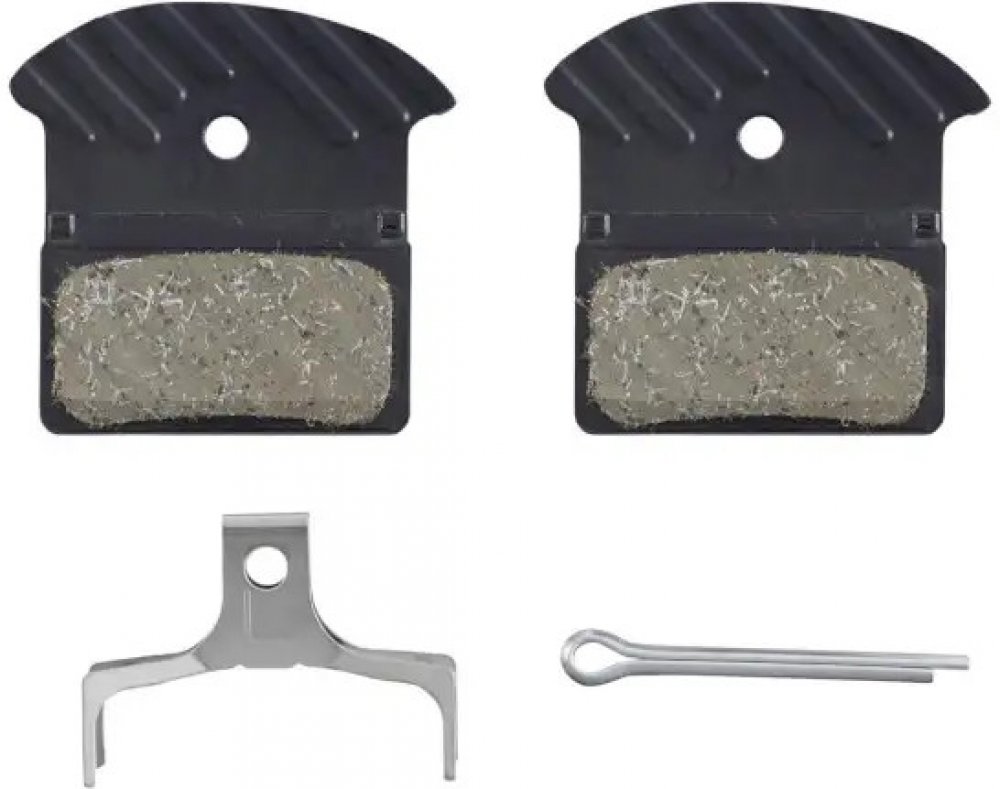 Brzdové destičky Shimano J05A s polymer brzdnou směsí, která byla oproti předchozímu modelu ještě vylepšena. Desičky jsou nyní ještě tišší a brzdná síla je lépe dávkovatelná.