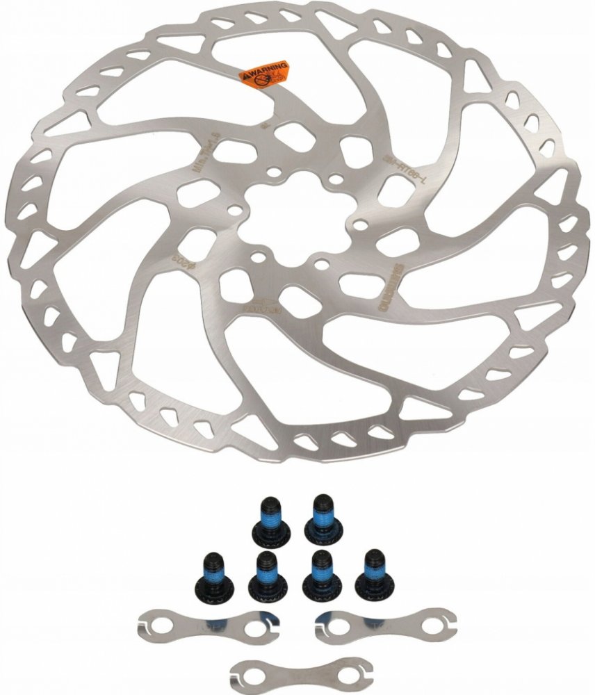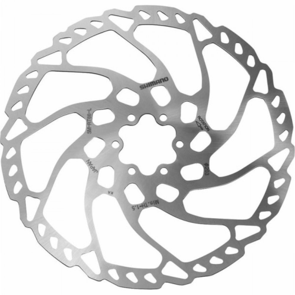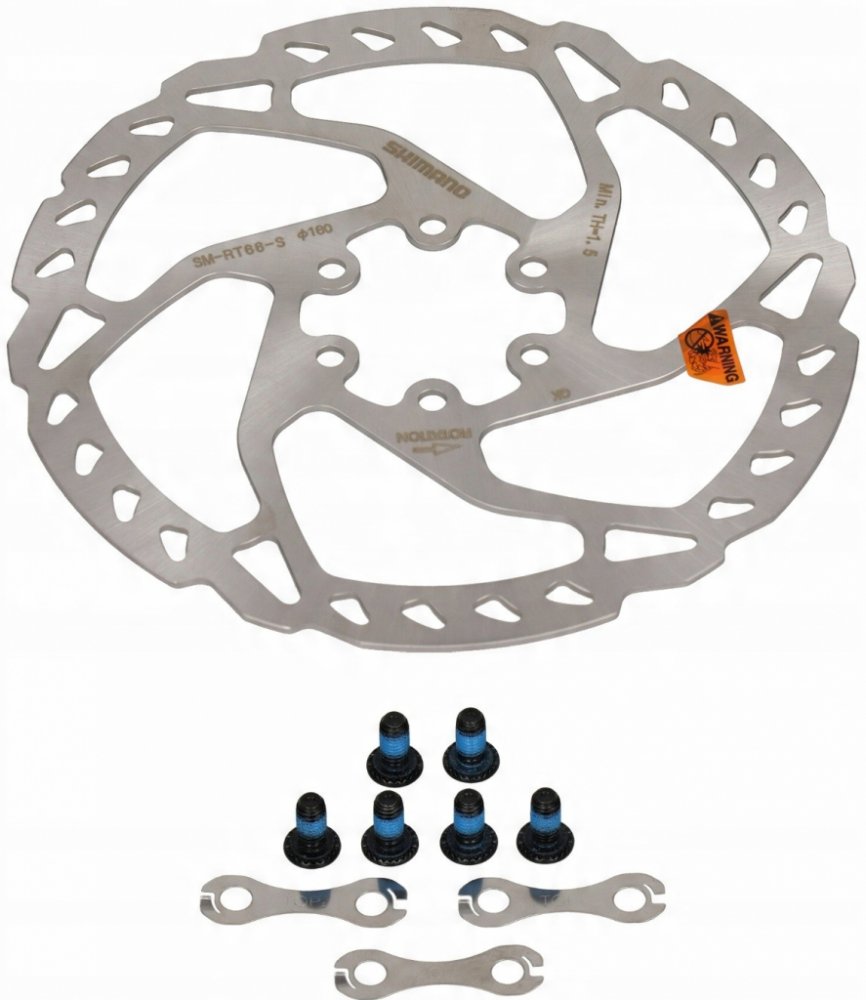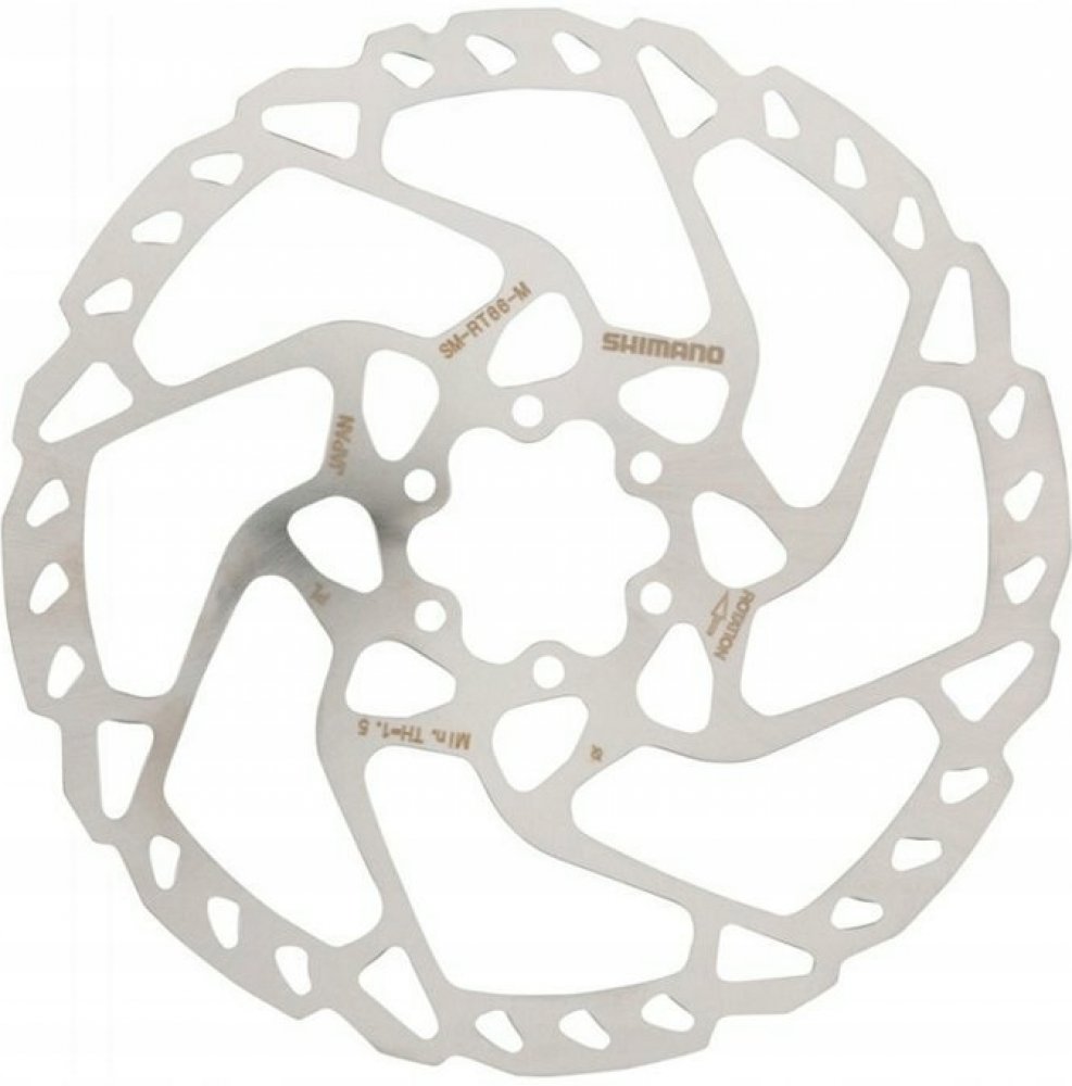 SHIMANO SLX SM-RT66 SHIMANO brzdový kotouč SLX SM-RT66 pro 6 děrové kotoučové náboje. Určený pro polymerové (resin) i metal (kovové) brzdové destičky. Nejsou kompatibilní se systémem Shimano Center-Lock. Brzdový kotouč Shimano SM-RT66 se 6 šrouby je vyroben z jednoho kusu lisované nerezové oceli, která byla dodatečně tepelně zpracována a leštěna. Je k dispozici s průměrem 160 mm a 180 mm a doporučuje se pro řadu ZEE, Deore a Alfine, ale lze jej použít i s jinými brzdami. Kotouče SHIMANO SM-RT66 poskytují konzistentní brzdnou sílu za všech jízdních podmínek. Součástí jsou 3 samosvorkové neuvolňující podložky pro rychlou a bezpečnou montáž a 6 montážních šroubů. - 6 šroubů (roztečný průměr 44 mm) - varianty průměru kotouče : 160mm /180 mm