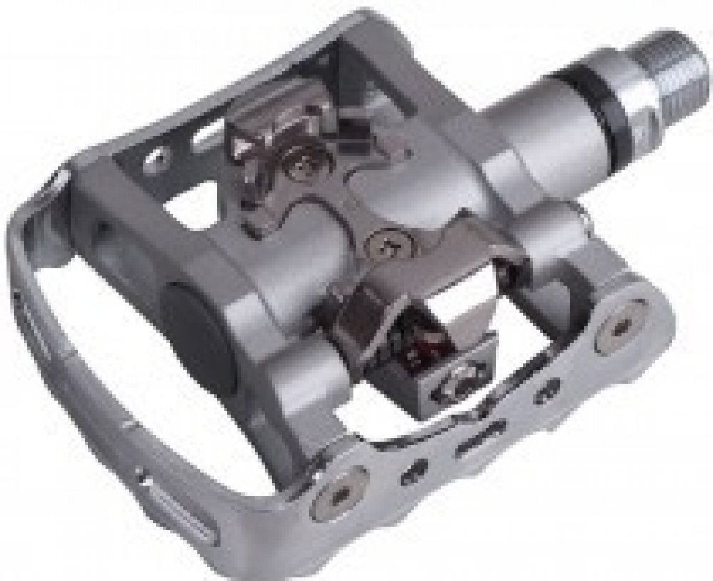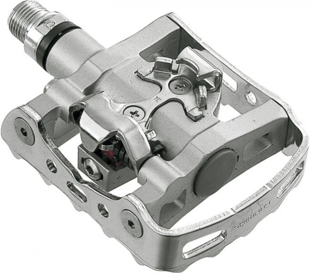 Kombinované nášlapné pedály SHIMANO PD-M324 jsou určené jak pro horská tak trekkingová kola. Univerzální pedály pro začínající jezdce se systémem SPD, vhodné pro každodenní používání. Kombinují účinnost SPD systému s obvyklou hliníkovou klecí pedálu. Jednostranný 'clipless' mechanismus umožňující naklapnutí tretry pouze z jedné strany má možnost nastavení předpětí zámku podle požadavků jezdce.