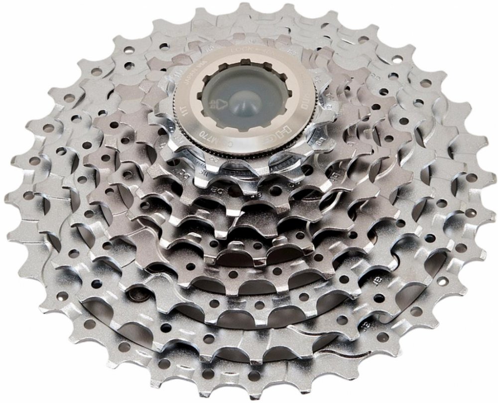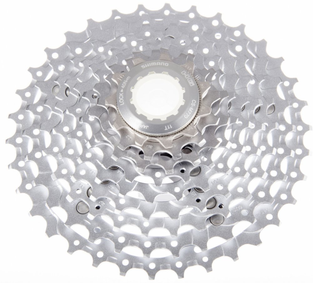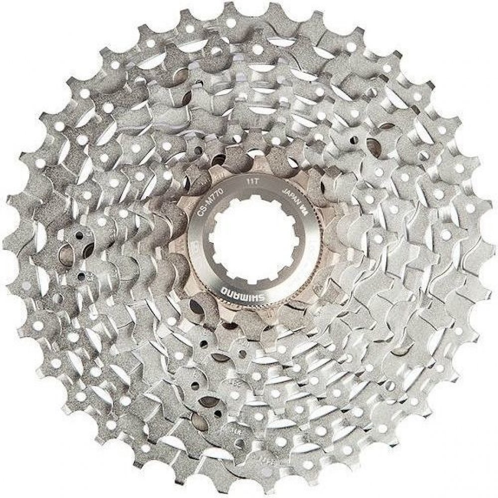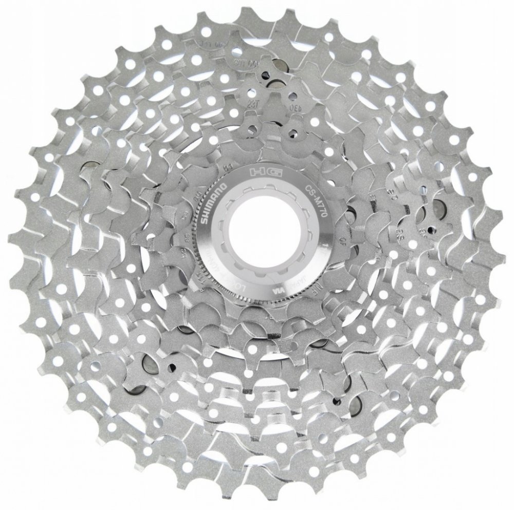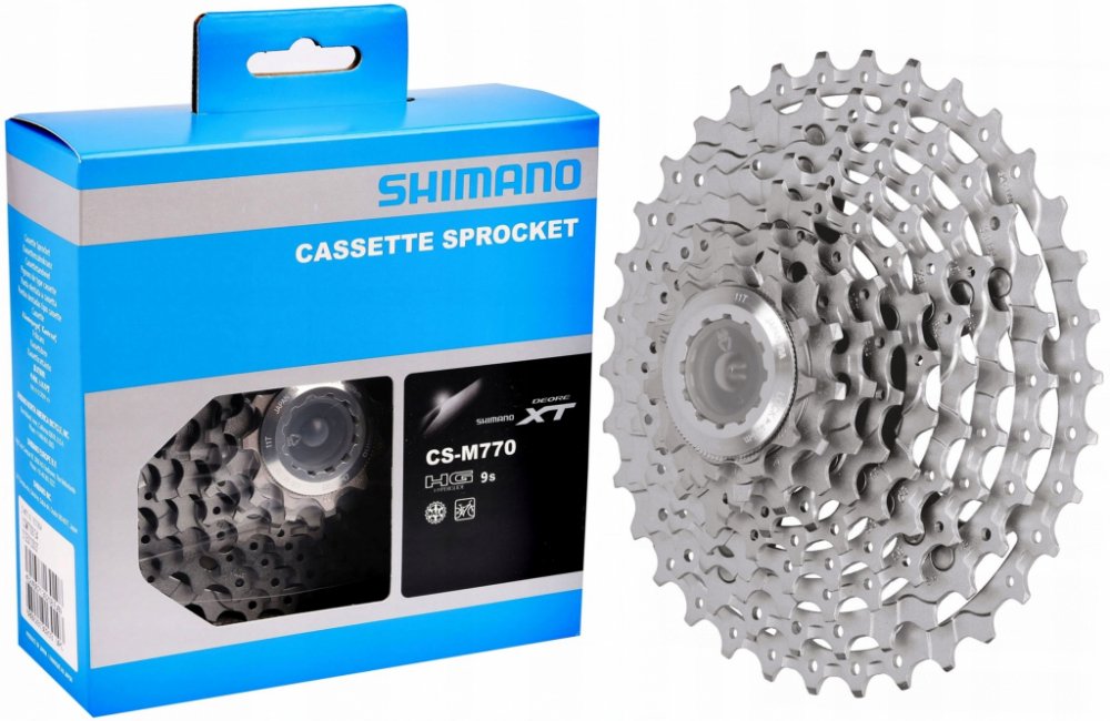 9-ti rychlostní kazeta SHIMANO M770 - XT vyznačující se spolehlivým chodem řetězu a přijatelnou hmotností pro sportovní použití na horská či krosová kola. HG pastorky obsahují řadící náběhy a speciální tvarování zubů. Profily zubů zlepšují vedení řetězu při řazení.