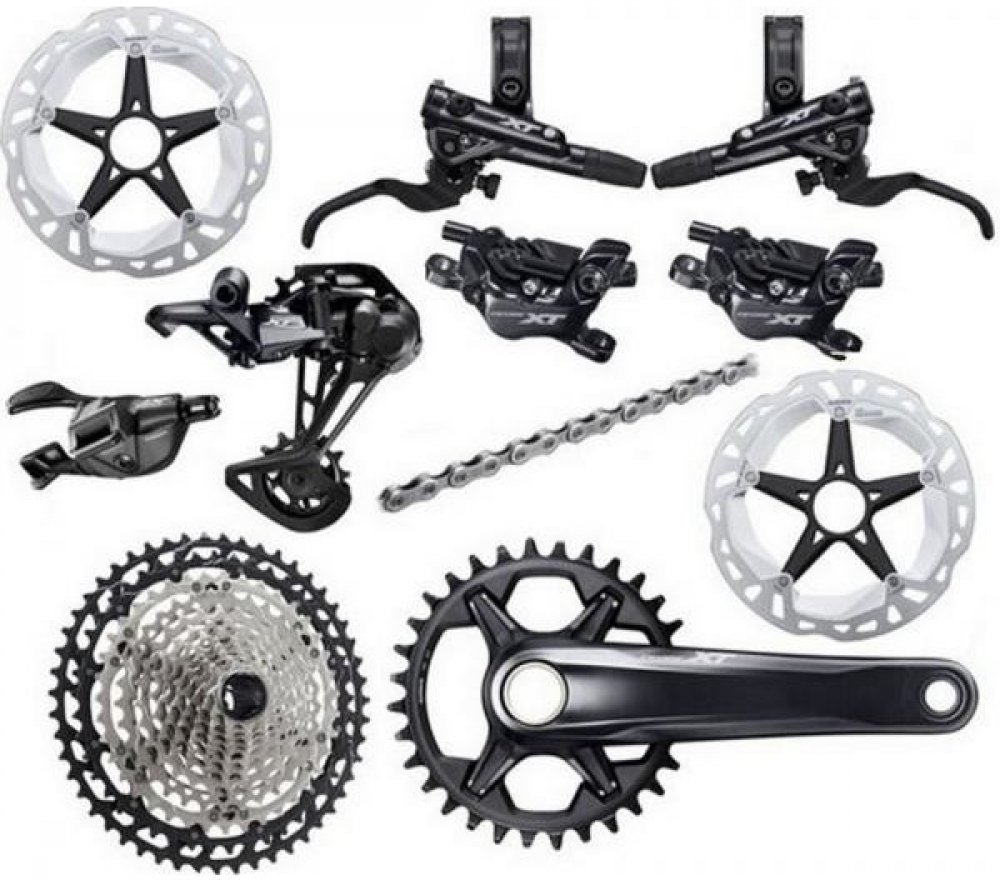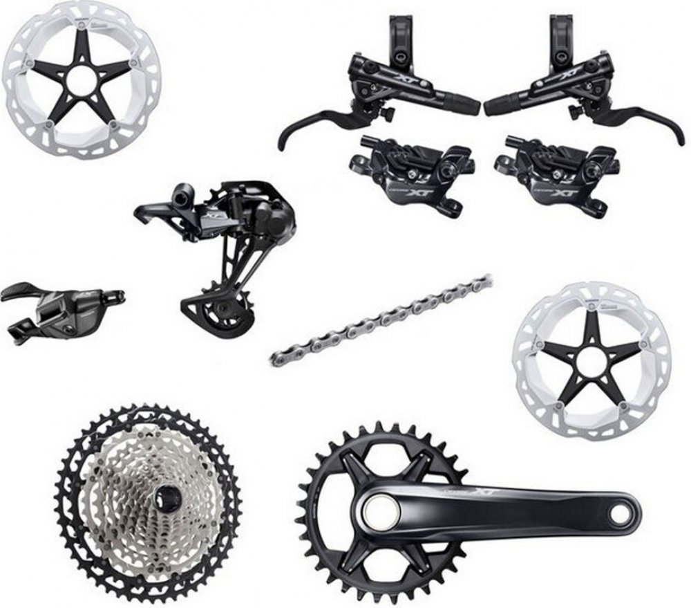 kompletní sada bez nábojůřadící páčka Shimano XT SL-M8100I-Spec 12speedpřehazovačka Shimano XT RD-M8100SGS dlouhé vodítkohydraulické kotoučové brzdy Shimano XT M8100, hadičky 850-1450mmJ-kit - naplněné brzdy, hadičky a třmeny - připraveno pro vedení rámembrzdové kotouče RT-MT800 180/160mmkliky Shimano XT FC-M8100 175mm 32zubůstředové složení SM-BB800 PressFitkazeta Shimano XT CS-M8100 12kolo 10x51řetěz Shimano XT CN-M8100vše v černé barvě