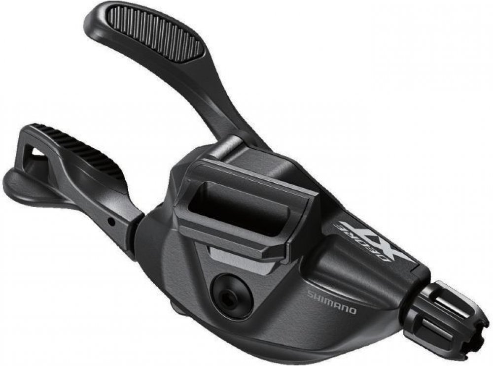Pravá řadicí páka s objímkou Shimano XT SL-M7100 na 12 pastorků. O 20 % rychlejší a o 35 % snadnější řazení než M8000. Two-way release s možností řazení na těžší převod jak ukazováčkem, tak i palcem jako u Sramu. Instant release s okamžitým řazením při pohybu páčky. Tělo z hliníku, páčky z hliníku, oceli a GFRP kompozitu. Dodáváno včetně lanka, bowdenu a koncovek.