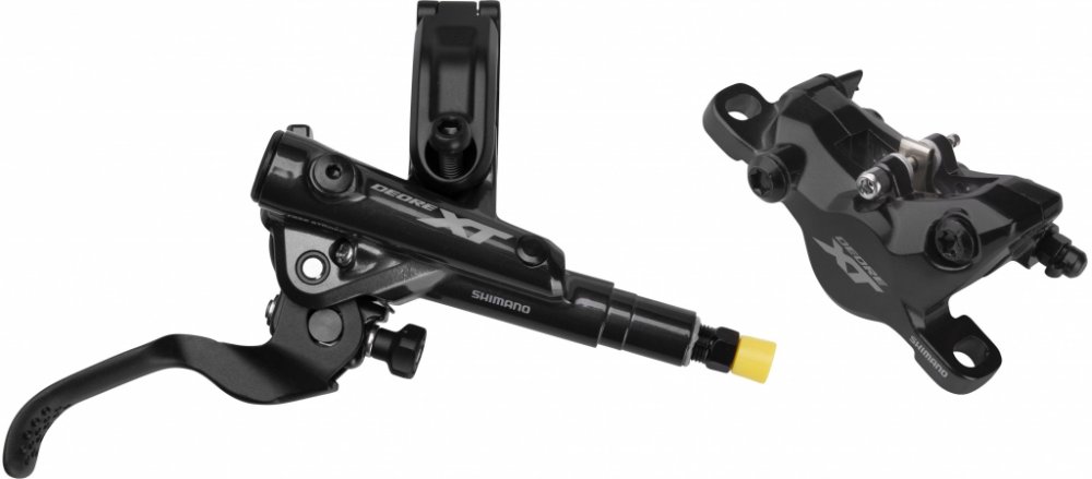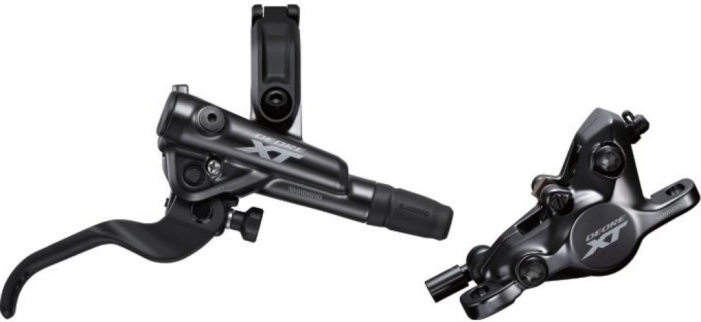 "Přepracovaná hydraulická kotoučová brzda Shimano Deore XT nesoucí označení BR-M8100. Tak jako předchozí model, je i BR-M8100 určena pro XC a maratonské použití a nabízí několik vylepšení. Změn doznala brzdová páka, která má novou objímku, kterou se brzda připevní k řídítkům, optimalizována byla také ergonomicky tvarovaná páčka pro dva prsty, která nyní nabízí menší úsilí potřebné pro stisk a line...