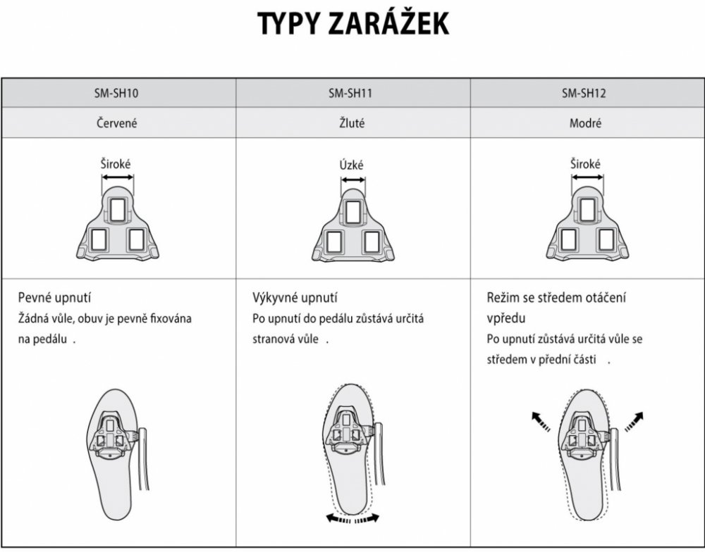 Zarážky SM-SH12, pro systému SPD-SL, s možností natočení tretry v pedálu na úrovni 2°. Pro lepší rozpoznání jsou modré barvy. Vhodné pro všechny pedály typu SPD-SL, od základního modelu PDR540 až po DURA-ACE. Vhodné pro cyklisty, kteří již začínají s pedálovým nášlapným systémem a potřebují mít možnost vůli pro pohyb nohy v pedálu. Dodáváno s upínacími prvky zarážky do tretry. Tyto zarážky mají pevné upnutí špičky zarážky a možnost natočení má jen pata.