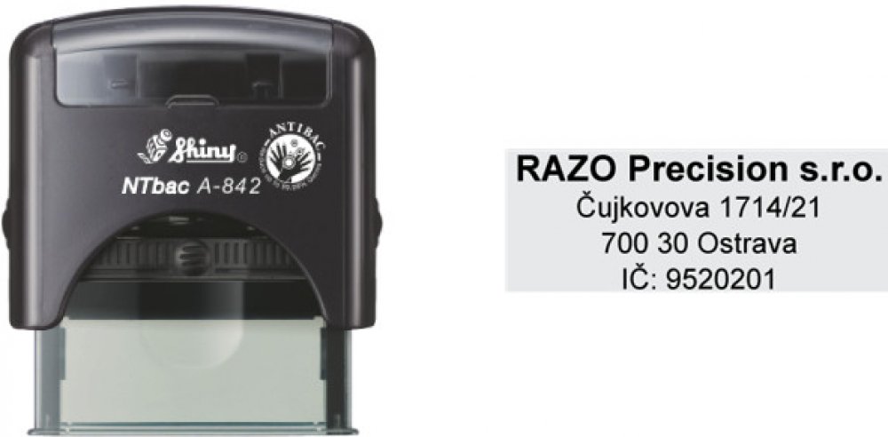Nové kvalitní samonamáčecí textové razítko řady ANTIbac s maximální velikostí otisku 38x14mm. Razítko se vyznačuje díky speciální úpravě při výrobě svou jedinečnou vlastností eliminovat případné bakterie na svém povrchu. Cena uvedena včetně výroby štočku s libovolným textem i grafikou.