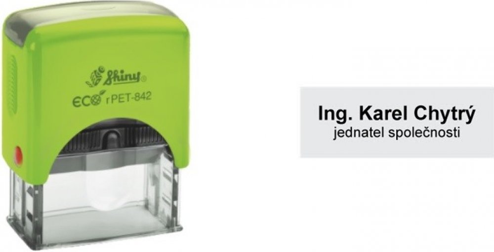 #html-body [data-pb-style=SUTH12U]{justify-content:flex-start;display:flex;flex-direction:column;background-position:left top;background-size:cover;background-repeat:no-repeat;background-attachment:scroll}Razítko Shiny rPET-842 ECO line, 38x14 mm Malé spolehlivé samonamáčecí textové razítko Shiny rPET-842 ECO. Na štoček lze umístit čtyři řádky textu. Je vhodné na jmenovku, jako podpisové razítko, nebo na základní firemní údaje pro podnikatele. S krytkou, kterou lze přikoupit, ze strojku můžete udělat malé cestovní razítko. Maximální velikost otisku až 38x14 mm. Transparentní díl strojku umožňuje přesné umístění otisku. Produkty označené značkou ECOLine jsou produkty vyrobené s podílem recyklovaných plastů ve výši přes 75% na každém výrobku. U řady produktů ECOLine PET jsou hlavní součástky razítka vyrobeny ze 100% z recyklovaných PET lahví. Samotné balení produktu je vyrobeno z neběleného materiálu.