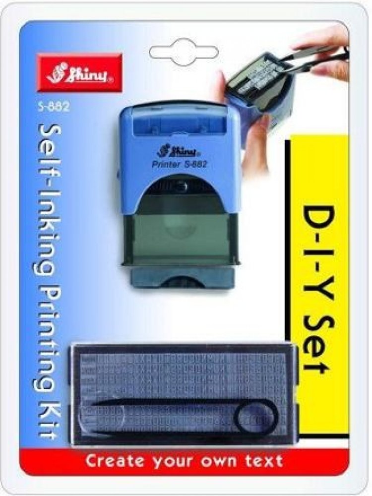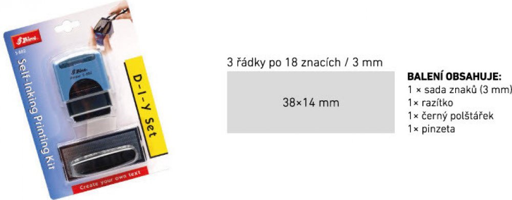 Samonamáčecí razítko s počtem řádků 3. Na razítku lze sestavit ve třech řádcích po 14 znacích libovolný text z přiložené sady znaků.