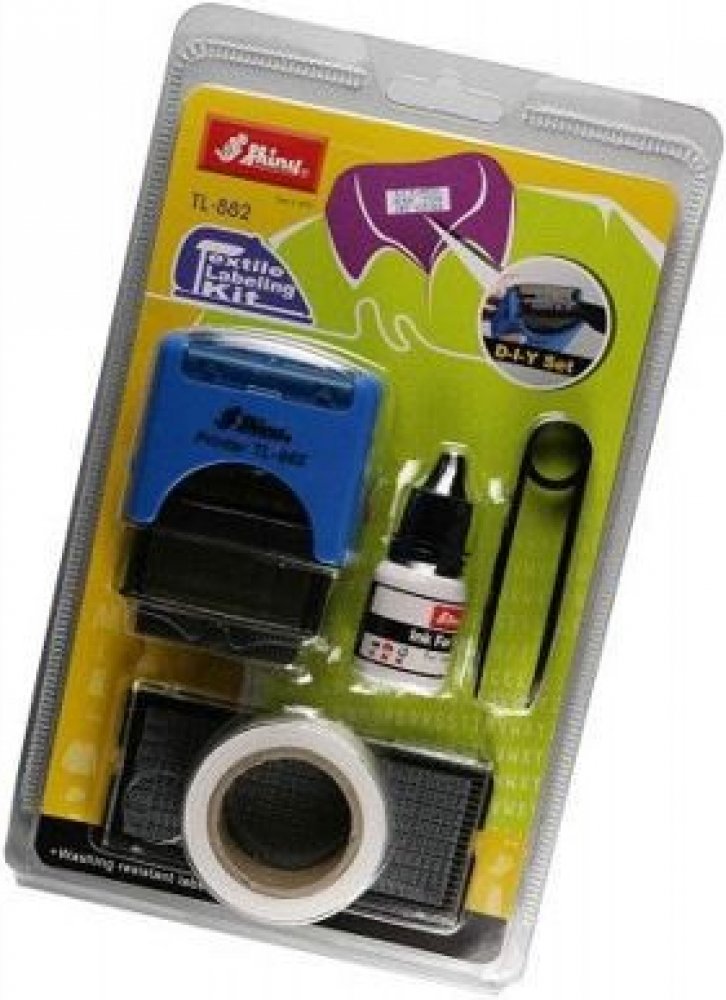 Razítko o velikosti otisku 38x14mm , textovou a číselnou sadu pro libovolnou změnu textu svépomocí, dále suchý polštářek, černou barvu na textil a nažehlovací pásku (vhodná pro barevné a tmavé textilní povrchy - jed...