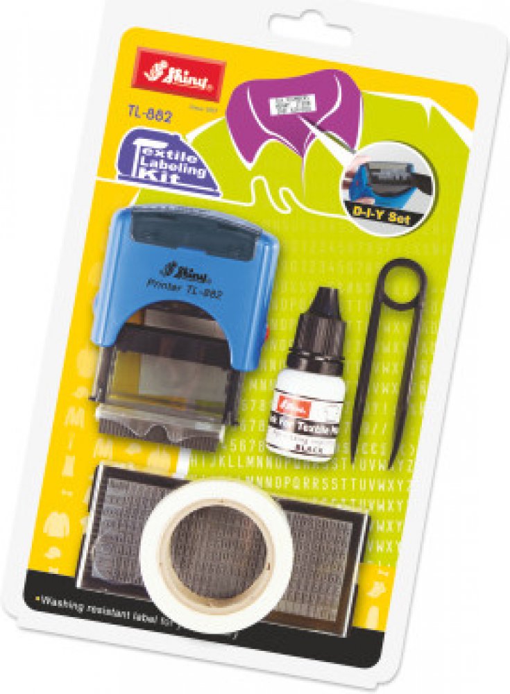 Razítko o velikosti otisku 38x14mm , textovou a číselnou sadu pro libovolnou změnu textu svépomocí, dále suchý polštářek, černou barvu na textil a nažehlovací pásku (vhodná pro barevné a tmavé textilní povrchy - jednoduše se potištěná páska na textil zažehlí).