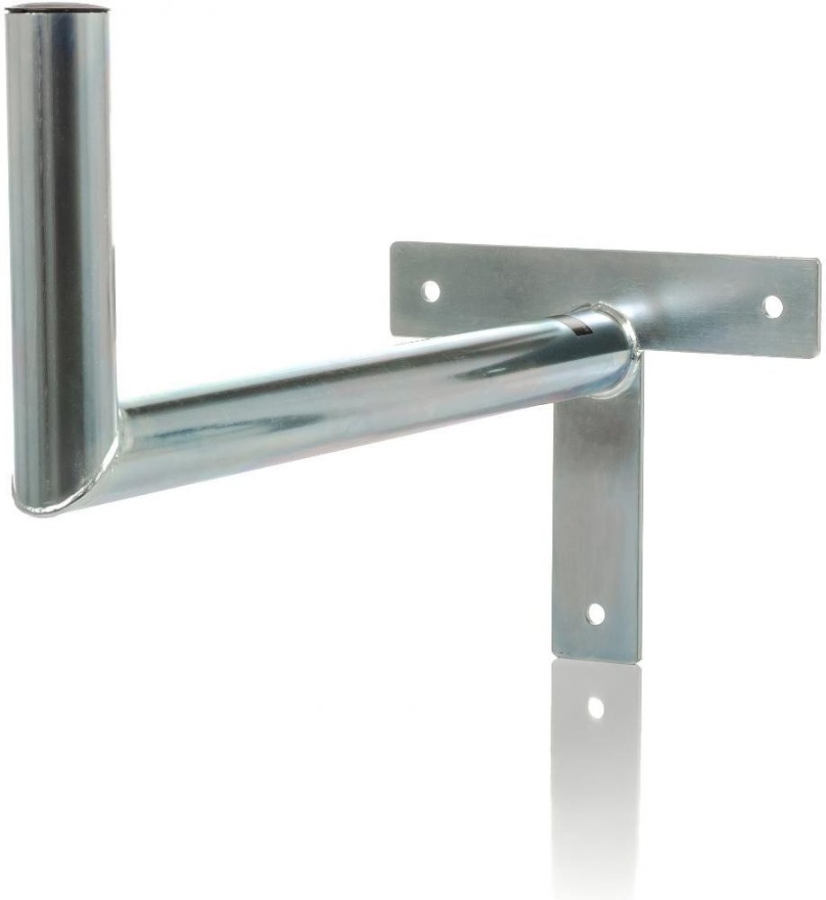 Držák na satelitní a internetové antény připevníte přímo na zeď. Maximální nosnost a rozměryDržák má maximální nosnost 45 kg. Jeho výška je 335 mm a délka od zdi 500 mm. Průměr trubky a povrchová úpravaPrůměr nosné trubky je 42 mm. Povrchová úprava je provedena pozinkováním, což zvyšuje odolnost vůči povětrnostním podmínkám.
