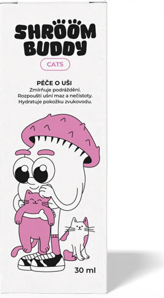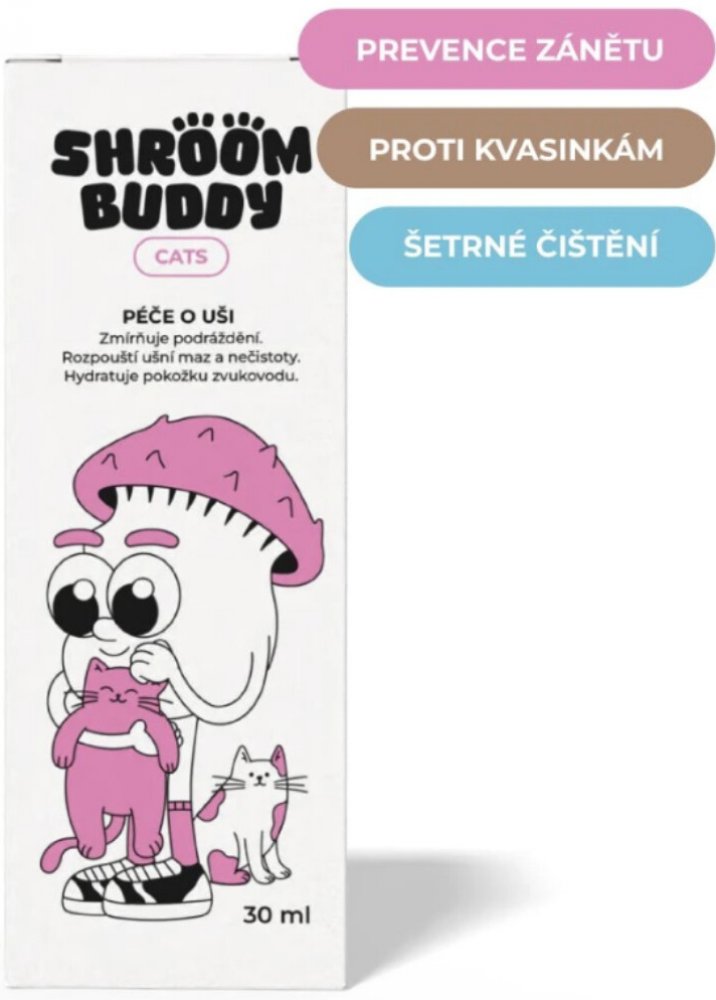 Tak čistá ouška - že teď už víte, že vás zcela ignoruje. Přípravek slouží k šetrnému čištění vnějšího zvukovodu, rozpouští ušní maz a nečistoty a zároveň chrání před mikroorganismy. Hydratuje vysušenou pokožku a zmírňuje podráždění. Je vhodný jak pro pravidelnou prevenci, tak při potížích, například při přemnožení kvasinek Malassezia pachydermatis. Pomáhá udržovat mikrobiální rovnováhu a předchází vysušení zvukovodu. Návod k použití přípravku kapky do uší pro kočky Obsah lahvičky důkladně protřepejte a nakapejte několik kapek přípravku do ucha. Jemně promasírujte okolí ucha, aby se přípravek dobře vstřebal. Poté ucho opatrně vytřete gázou. určeno pro všechna kočičí plemena vyrobeno v ČR českou firmou udržitelná a celosvětově patentovaná technologie biologický neinvazivní přípravek pro kočky první kosmetika pro zvířecí miláčky #meowtime is the new #metime Složení přípravku Shroom Buddy Kapky do uší Cats Olea Europea Fruit oil, Heliantus annuus seed oil, Pythium oligandrum in maize extract, Tocopherol natural. Jak skladovat přípravek Svěží dech Cats? Skladujte na suchém místě při pokojové teplotě 15–25 °C a relativní vlhkosti do 40 %. Obsah balení: 30 ml Upozornění: Veterinární přípravek – určen pouze pro zvířata. Uchovávejte mimo dosah dětí. Není určeno k vnitřnímu užití. Schválení: Číslo schválení veterinárního přípravku: 007-25/C Likvidace obalu: Obal zlikvidujte jako běžný komunální odpad – složky papír/plast.