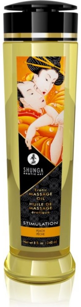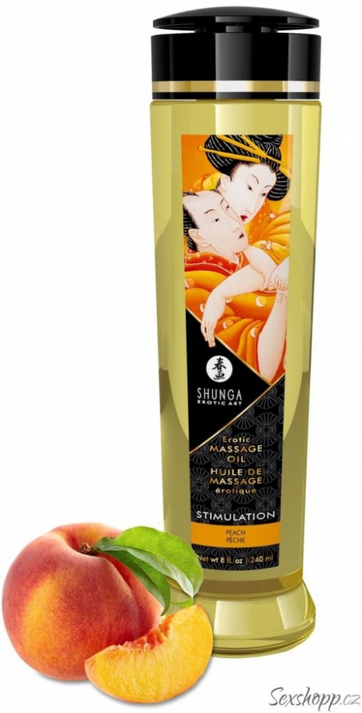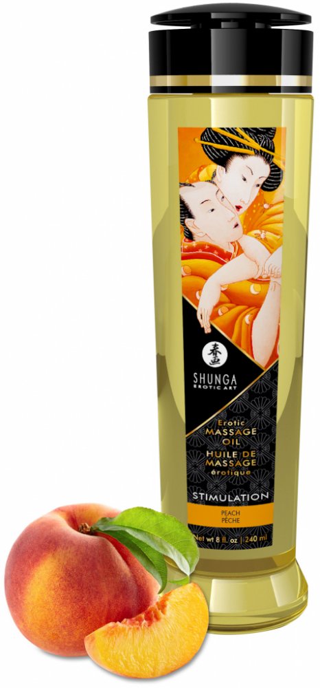 Erotické masáže mají dlouholetou tradici a jsou základem našeho intimního světa. Vychutnejte si i vy orientální potěšení s relaxačními účinky ve spojení s exkluzivním a kvalitním složením. SHUNGA EROTIC MASSAGE OIL STIMULATION v obsahu 240 ml je jemný masážní olej sladké vůně zralých broskví získaný z éterických olejů lisovaných za studena. Obsahuje směs z mandlového, sezamového, avokádového, slunečnicového oleje a z oleje ze semínek hroznového vína. Kombinace s afrodiziakálními esencemi ylang-ylang a yohimbe s přídavkem vitamínu E má kouzelnou moc uvolnit partnera a poskytnout mu luxusní povznášející pocity s pikantním dozvukem, takže se vám otevírají dveře i ke smyslnému zakončení večera. Snadno se roztírá, perfektně hydratuje kůži a poskytuje jí hebkost a pružnost bez pocitu mastnoty. Je dermatologicky testovaný a nezpůsobuje alergické reakce, proto je zcela bezpečný pro lidskou pokožku. Neobsahuje žádné živočišné tuky, takže potěší nejen vegany. Lahvička se silikonovou pojistkou nabízí čisté a přesné dávkování.