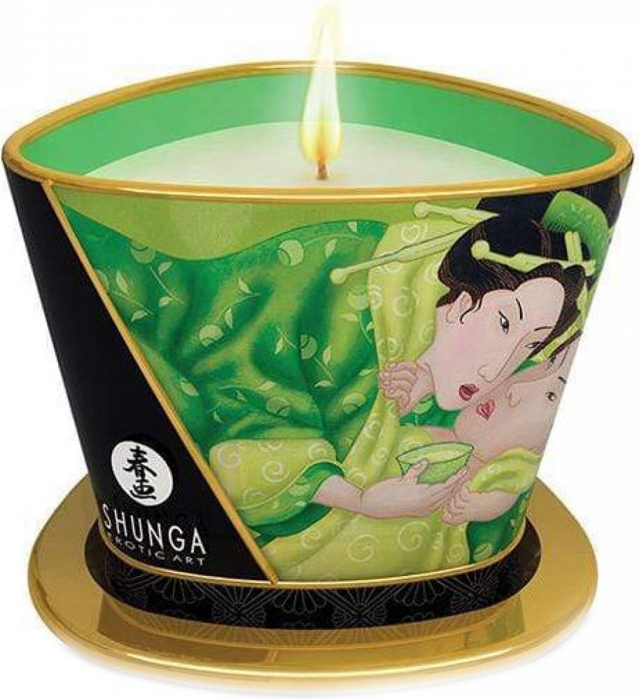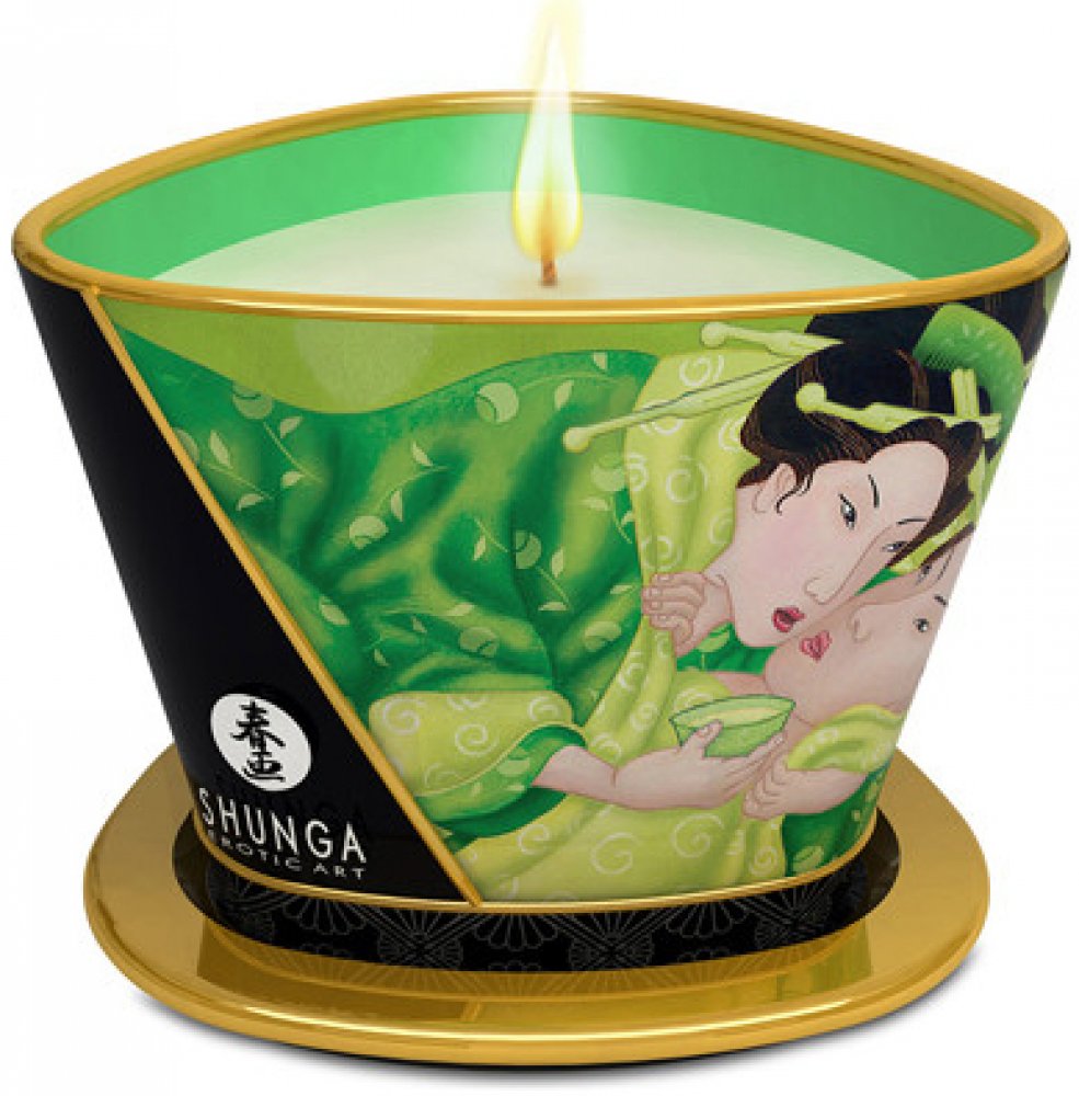 Pro chvíle smyslné masáže Luxusní masážní svíčka Zenitude od Shunga s jemnou jemnou vůní zeleného čaje, která se při zapálení svíčky příjemně šíří místností. Vosk ze svíčky se roztaví v příjemně hřejivý vyživující masážní olej, který lze aplikovat přímo na pokožku pro smyslnou a vášnivou partnerskou masáž. 100procent přírodní olej vyživuje pokožku a činí ji hedvábně jemnou a vláčnou pro dlouhotrvající potěšení z masáže. Masážní svíčka ve stylové kovové dóze s trojúhelníkovým tvarem a víčkem. Hoří až 40 hodin 170 ml.
