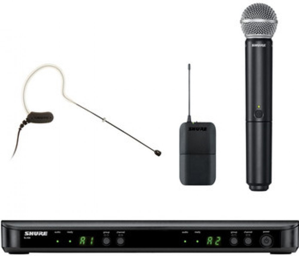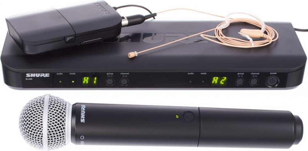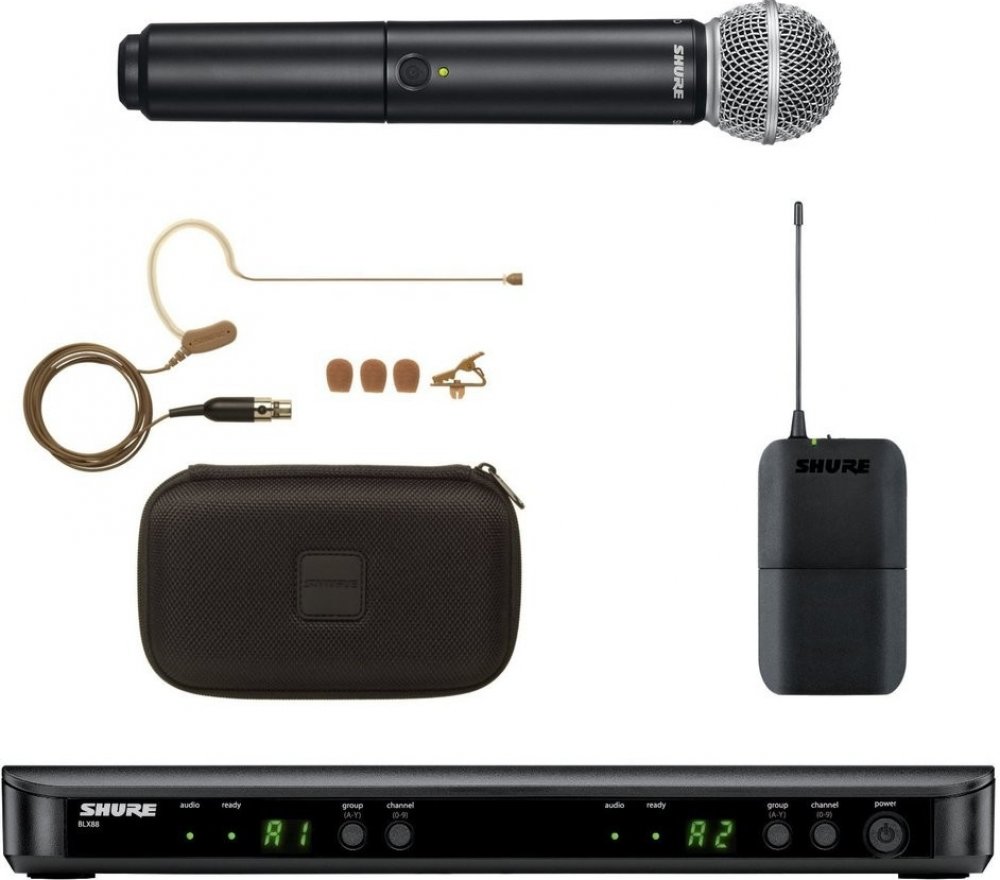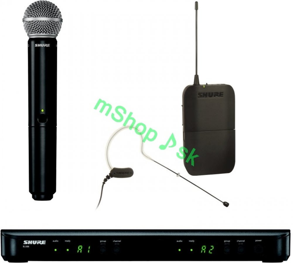 Shure - BLX1288E/MX53 M17 • duální bezdrátová sada • ruční mikrofon (handheld) BLX2/SM58 + mikrofon za ucho (earset) MX153 + vysílač BLX1 + přijímač BLX88E • pracovní frekvence: 662-686 MHz
