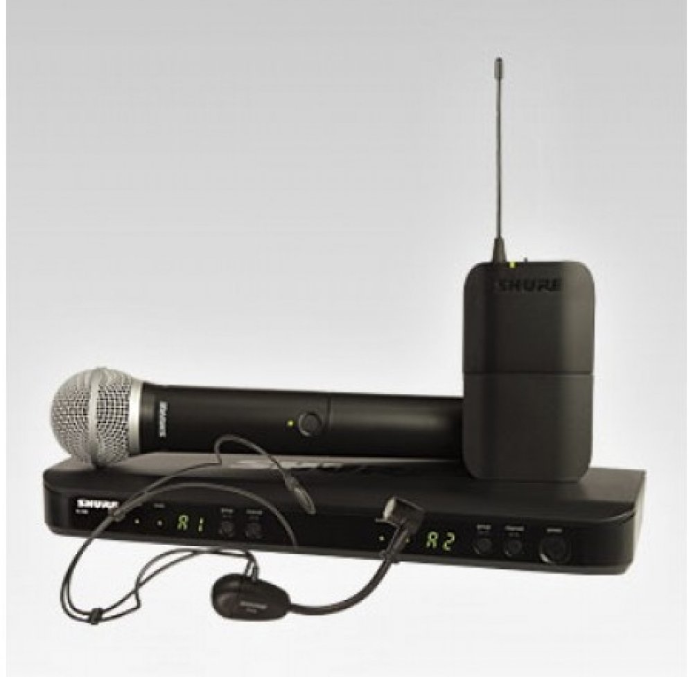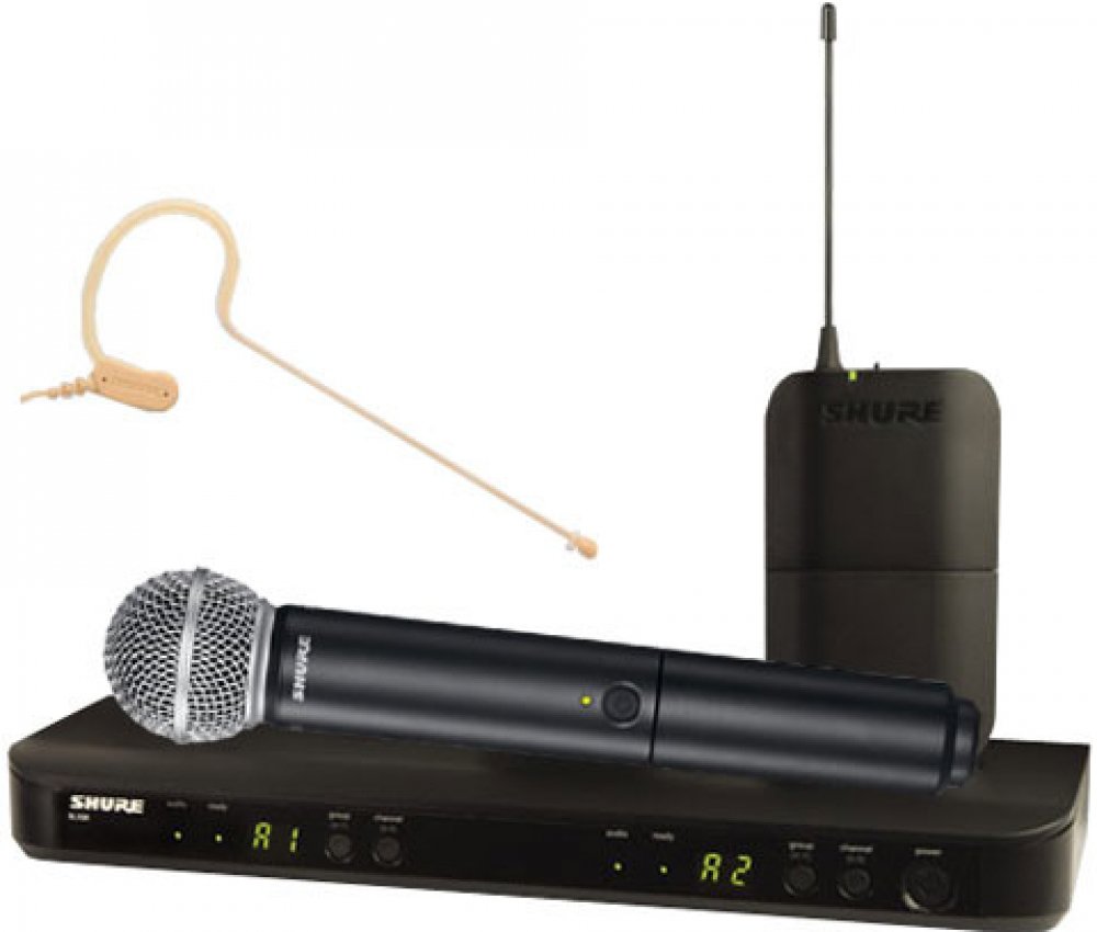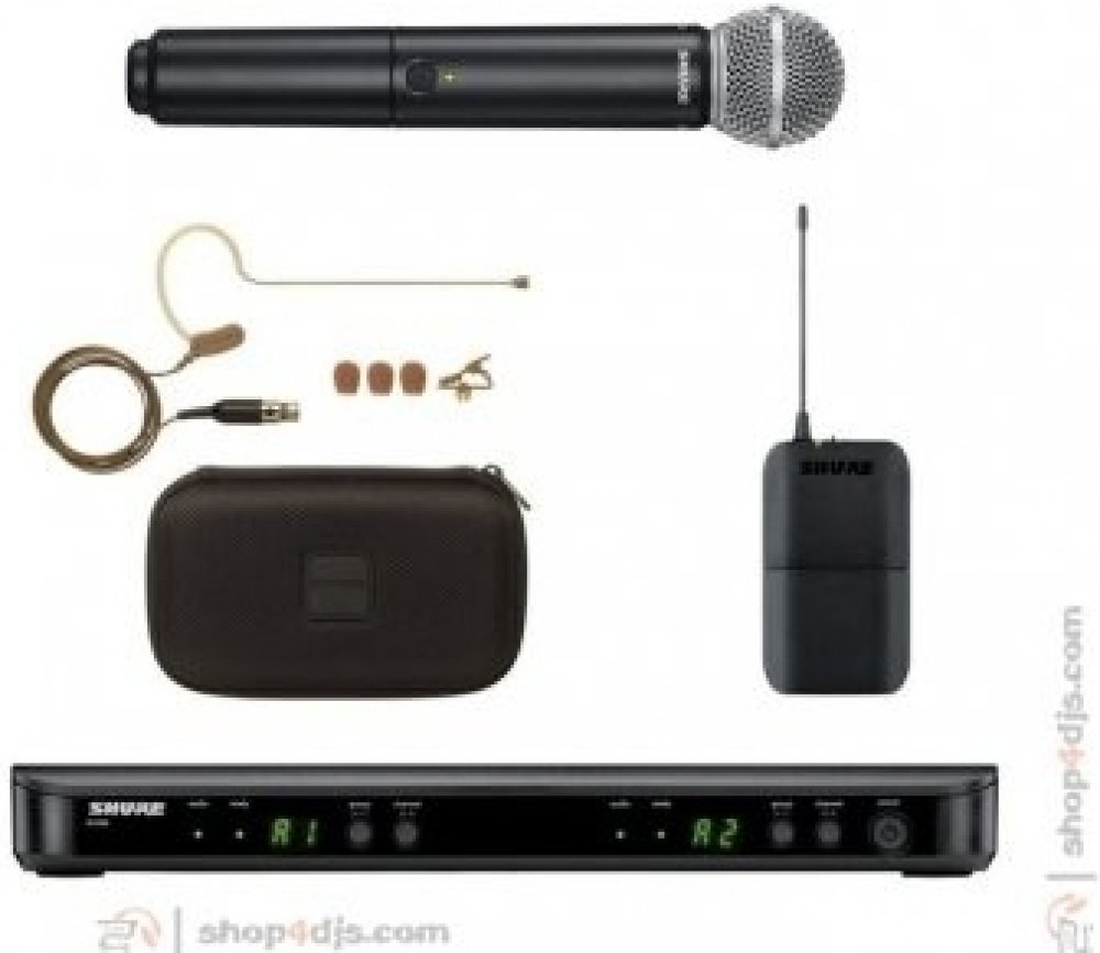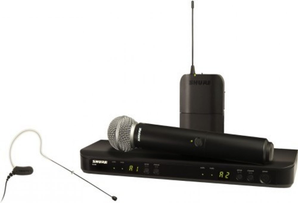Shure - BLX1288E/MX53 M17 • duální bezdrátová sada • ruční mikrofon (handheld) BLX2/SM58 + mikrofon za ucho (earset) MX153 + vysílač BLX1 + přijímač BLX88E • pracovní frekvence: 662-686 MHz