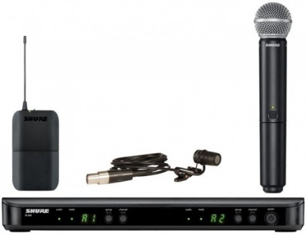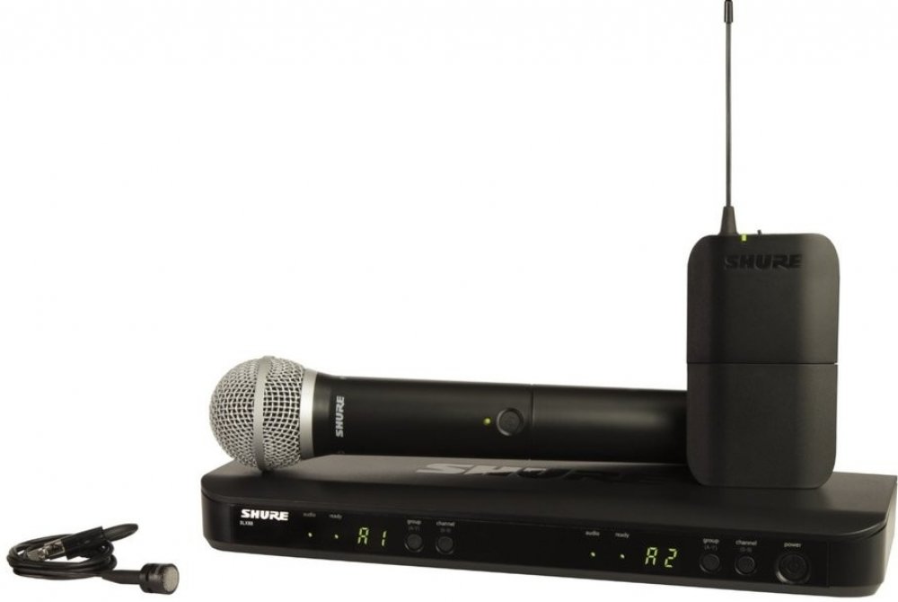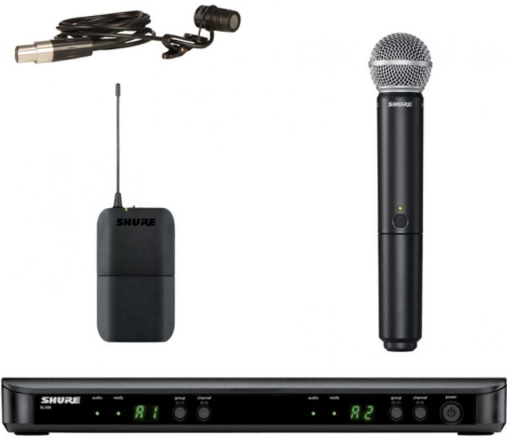 Shure - BLX1288E/W85 K3E • duální bezdrátová sada • ruční mikrofon (handheld) BLX2/SM58 + klopový mikrofon (lavalier) WL185 + vysílač BLX1 + přijímač BLX88E • pracovní frekvence: 606-630