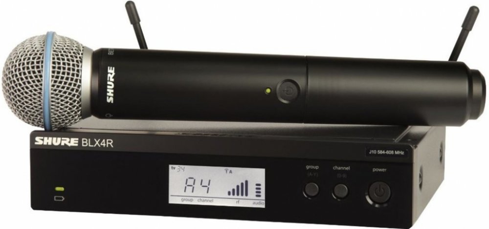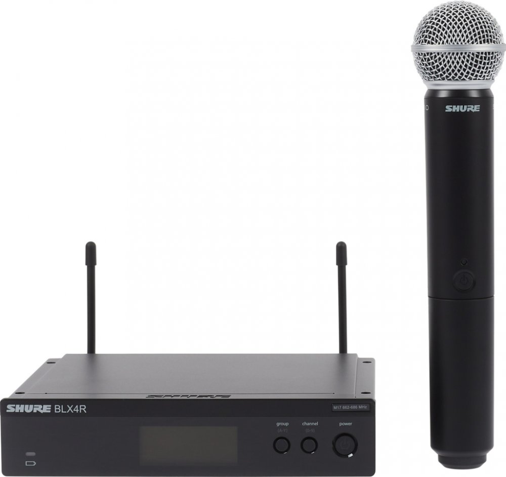Shure - BLX24RE/SM58 M17 • bezdrátová sada • ruční vysílač s mikrofonní vložkou PG58 + BLX2 + BLX4R • 2x AA baterie • automatická synchronizace s přijímačem • dosah: 91 m • možnost provozu až 12 systémů současně • pracovní frekvence: 662-686 MHz