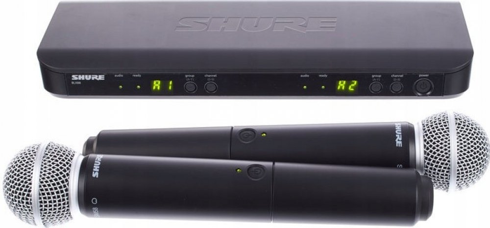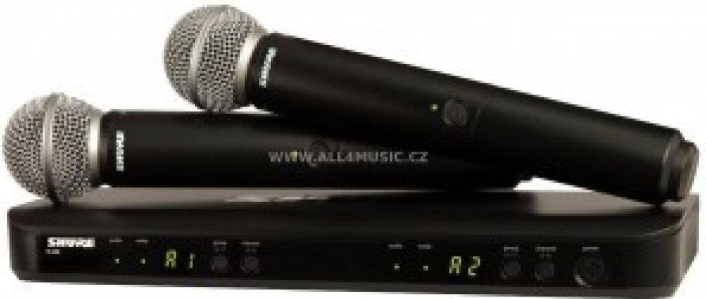 Dvoukanálový bezdrátový systém se dvěma ručními mikrofony. Shure PGW dual systém, BLX88E + 2x SM58 Katalog nových bezdrátových systémů (EN) Dual Channel Handheld Wireless System Wireless Systems Family BLX System Includes BLX2 Handheld transmitter with choice of microphone cartridge. BLX88 Dual channel receiver with microprocessor-controlled internal antenna diversity. Shure BLX Wireless Systems c...