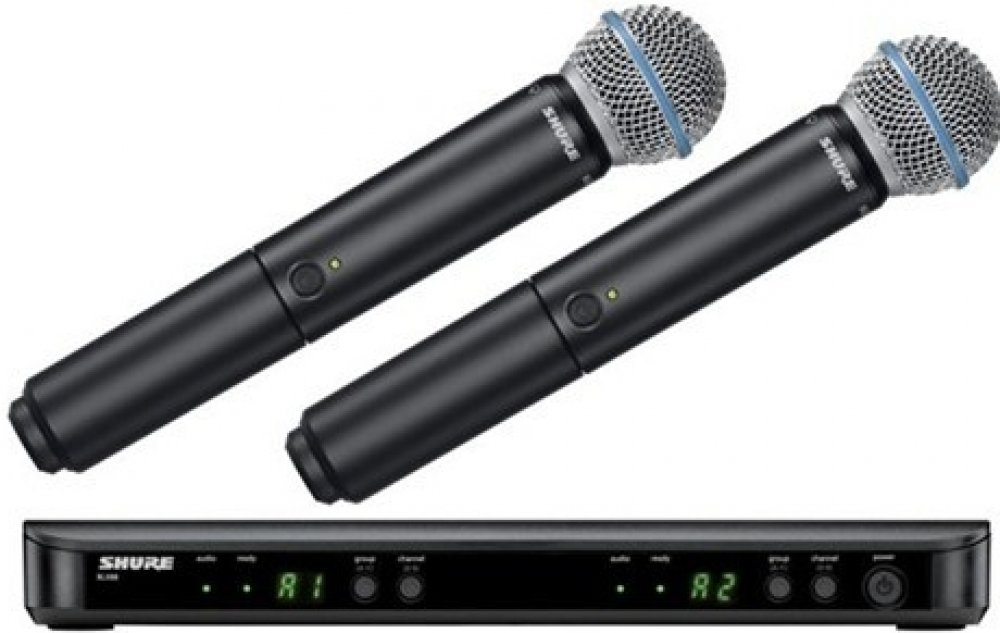 Shure -BLX288E/SM58 M17 • duální bezdrátová sada • 2x bezdrátový ruční vysílač s mikrofonní vložkou Beta 58 + 2x vysílač BLX2 + přijímač BLX88E • pracovní frekvence: 662-686 MHz