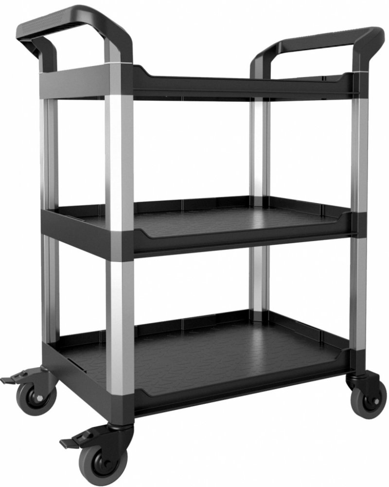 Univerzální použití, TPR 4" kolečka absorbují nárazy, poskytují ochranu povrchu podlahy a tichý provoz, 2 kolečka s aretací, celková nosnost 200 kg, 70 kg na polici, 3 police ABS s celkovou plochou 1,2 m2, ocelová konstrukce, barva černá / stříbrná, zaoblené plastové rohy, při nárazu nedojde k poškození stěn nebo překážek. Rozměry (š)796 × (h)470 × (v)985 mm.