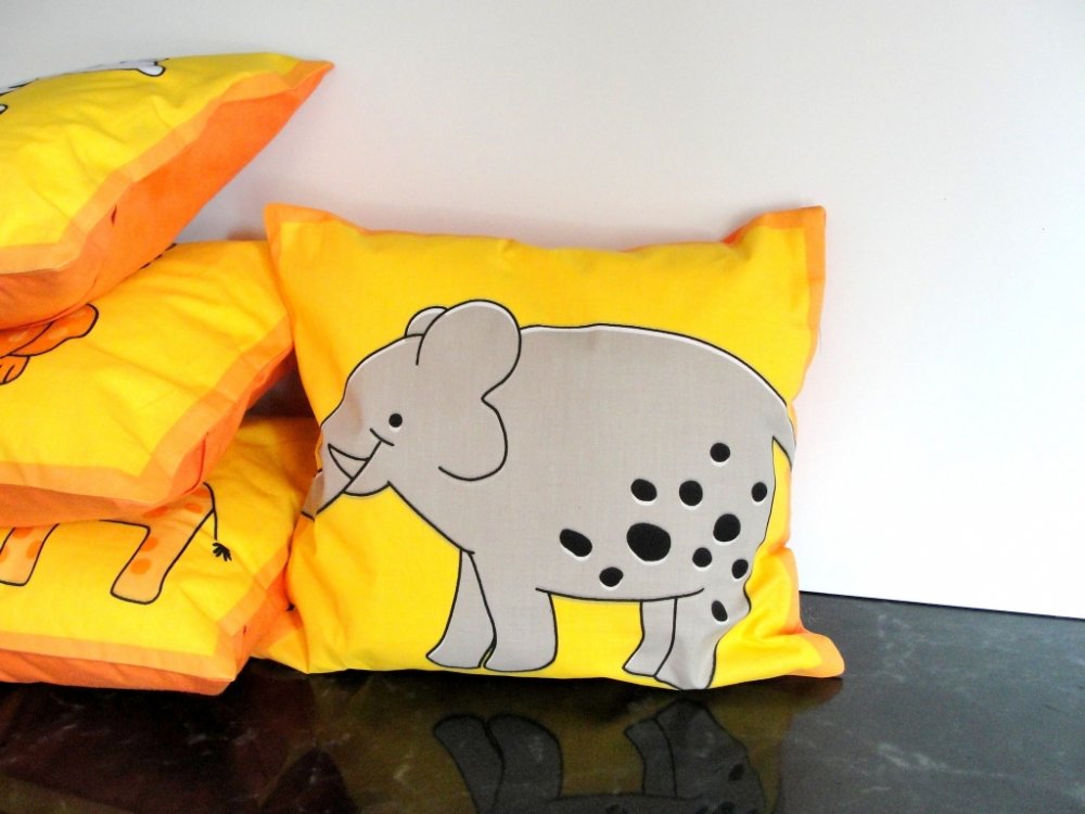 Originální ručně šitý polštářek s odnímatelným povlakem na zip cca 30 cm x 30 cm z velmi pevné a kvalitní bavlny. Na přední straně zářivě žlutý podklad s motivem slona. Zadní strana jednobarevná oranžová. Povlak je zavírací na krytý kvalitní pevný zip s plastovým jezdcem bez táhla v bílém provedení. Zip je krytý látkou a proto nikde netlačí. Povlak je vhodný a bezpečný pro malé děti.