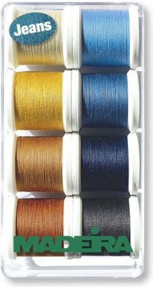 Šicí nitě PES Madeira Aerofil extra silné JEANS 35 box (8x100m) Nit Madeira Aerofil 35 je vysoce kvalitní polyesterová extra silná a mimořádně odolná šicí nit určená pro šicí stroje i ruční šití od renomovaného výrobce nití Madeira. Nit je určená pro namáhané švy a ideální pro šití džínoviny, kůže a jiných těžkých látek. Nit je vhodná pro ozdobné švy a dekorativní šití i pro šití knoflíkových díre...