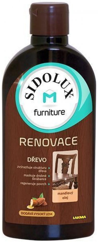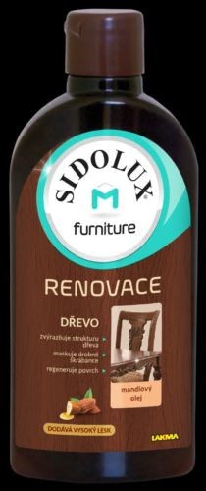 Čistí povrch nábytku, zabraňuje pronikání nečistot do hloubky a zároveň obnovuje dřívější vzhled. Po aplikaci Sidolux M Furniture prostor příjemně provoní mandlovou vůní. Jednoduše se aplikuje a leští.