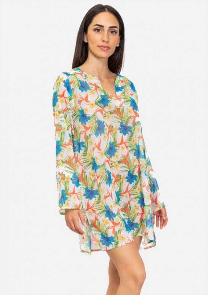 Dámská tunika italské značky Siélei. Tunika je ušitá z lehkého šifónového materiálu, má volnější střih do "A"čka, dlouhý rukáv a délku nad kolena. Na bocích jsou větší rozparky. Tunika má volný výstřih do "V", je průsvitná a je proto nejlepší na plavky k bazénu nebo na pláž. Materiálové složení: 100% polyester