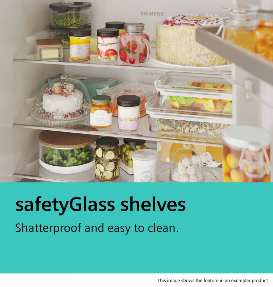 Všechny skleněné police jsou vyrobeny z extra pevného a snadno čistitelného bezpečnostního skla. Pokud se něco převrhne, rozlitá tekutina se zachytí a nerozlije se do zbytku prostoru chladničky.