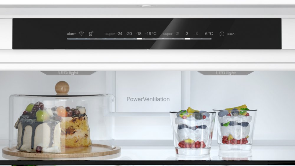 Rádi vidíte veškeré ingredience v tom nejlepším světle? Zabudované úsporné LED světlo zajišťuje rovnoměrné osvětlení v celém interiéru chladničky. Své potraviny tak budete mít stále na očích a vše najdete na první pohled. A protože jsou LED diody umístěny v přední části chladničky, ani objemnější potraviny nestíní. Pokud je váš spotřebič vybaven funkcí Home Connect, můžete LED světlo zapínat a vypínat nebo nastavovat jeho jas prostřednictvím aplikace Home Connect.