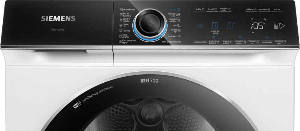 touchControl tlačítka: 1 košile, 5 košil, základní nastavení, suché k žehlení, formální oděv, suché do skříně, extra suché do skříně, nastavení konce sušení, poloviční náplň, dětská pojistka, ochrana proti zmačkání, oblíbený, tlačítko power, vzdálený start, šetrný, intelligentDry: perfektní program sušení vycházející z posledního pracího cyklu, start/reload/pauza, varioSpeed, odložení startu až o 24 hod.