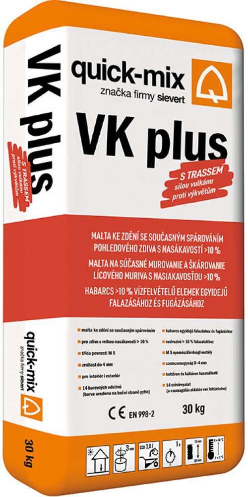 VK PLUS je vysoce kvalitní malta navržená pro efektivní zdění a současné spárování pohledového zdiva z keramických, betonových a kamenných stavebních prvků. Obsah trasu v maltě minimalizuje riziko výkvětů a zvyšuje odolnost a estetickou kvalitu zdiva. Ideální pro cihly s nasákavostí větší než 10 %.